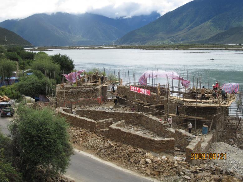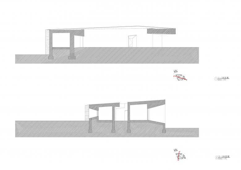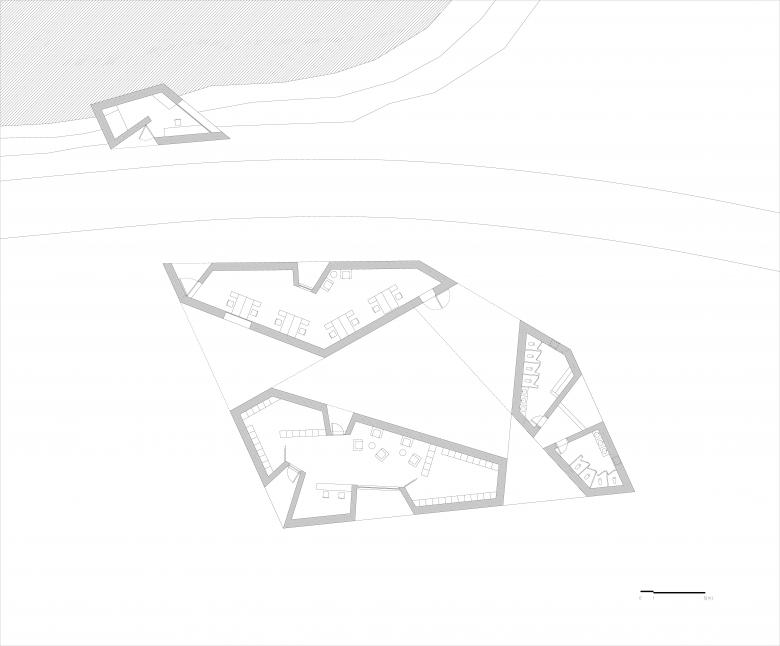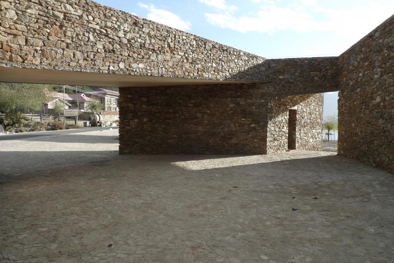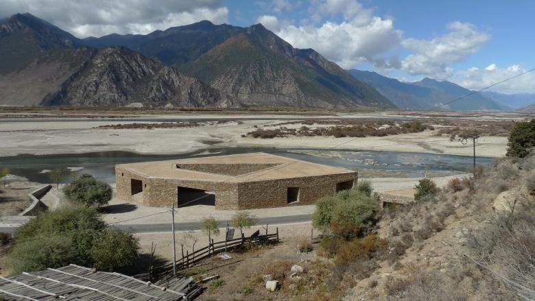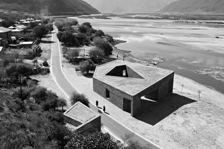Mirui Road is a tourist route that meets Highway 318 connecting Tibet and Sichuan Province. This road meanders southwards along the Niyang River and separates the riverbank from the nearby mountains. Within twenty kilometres of the Yarlung Tsangpo Grand Canyon, the landscape of the Niyang River can be enjoyed from the road. Daze Village was chosen to be the entrance point for this tourist attraction. Since there is little land left for further development in the village, the riverbank along the road was the only site remaining for a tourist centre. The building’s external form is a response to the site conditions. The inner public space is “carved” out of the irregular-shaped volume. The central court-yard connects four openings, which respond to the orientation and circulation. The remaining volume after “carving” accommodates three major interior functions: a ticket office, a changing room for rafting, and toilets.