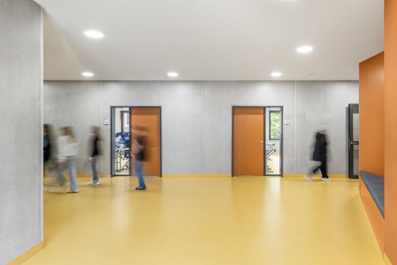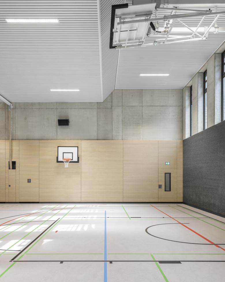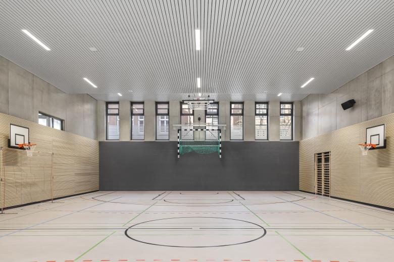 Die abgesenkt integrierte Sporthalle im Erdgeschoss des Neubaus spart Fläche und bietet Mehrwert. Dank ihrer zentralen Lage und der großzügigen Verglasung sowie den Sichtbezügen nach innen und außen wird die Halle zu einem sichtbaren, lebendigen Bestandteil des Schulalltags.