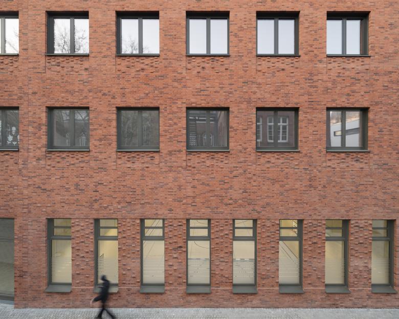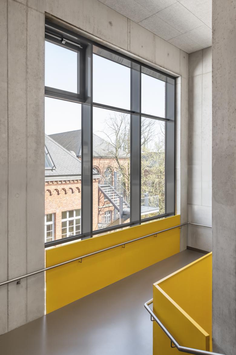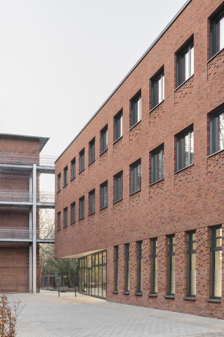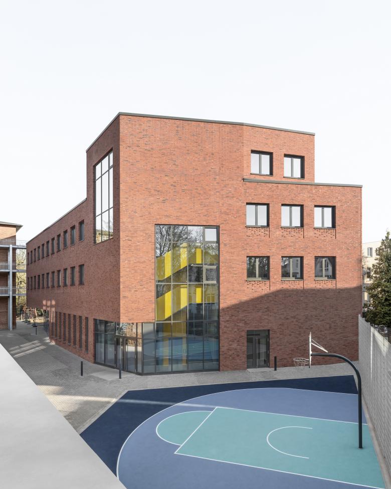Der Neubau ersetzt eine frühere Sporthalle und rahmt den Schulhof mit seiner klaren Kubatur. Mit einem Rotklinker und dunklen Dach nimmt der Neubau Bezug auf den Bestand, ergänzt ihn aber mit einer eigenständigen, modernen Sprache. Großzügige Verglasungen schaffen Transparenz und verbinden Innen- und Außenräume.