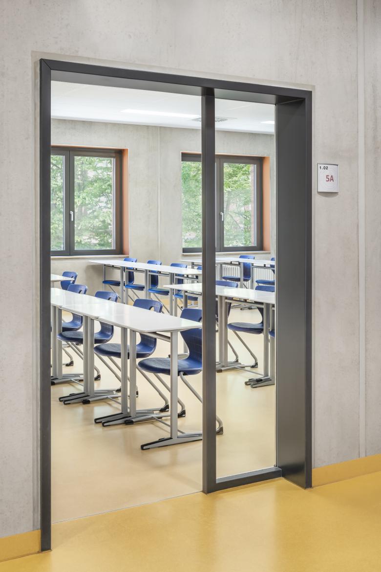 Im Inneren setzt der Neubau auf flexible Strukturen. Die Lernräume sind so gestaltet, dass sie kooperatives Arbeiten ebenso ermöglichen wie individuellen Rückzug. Ergänzt wird das Raumprogramm durch Fachräume, Musikbereiche und einen Ganztagsbereich mit variabler Nutzung.