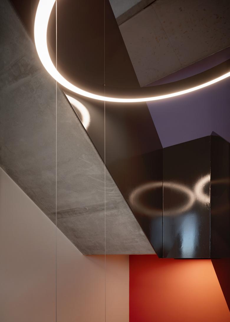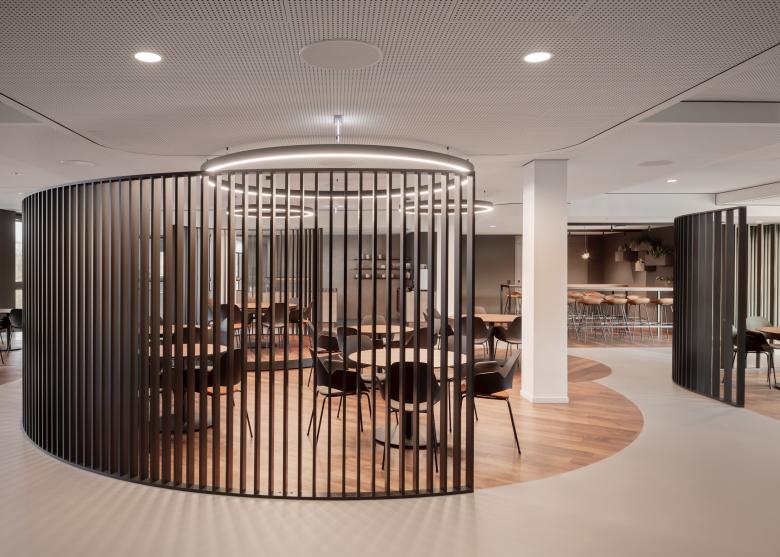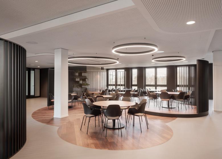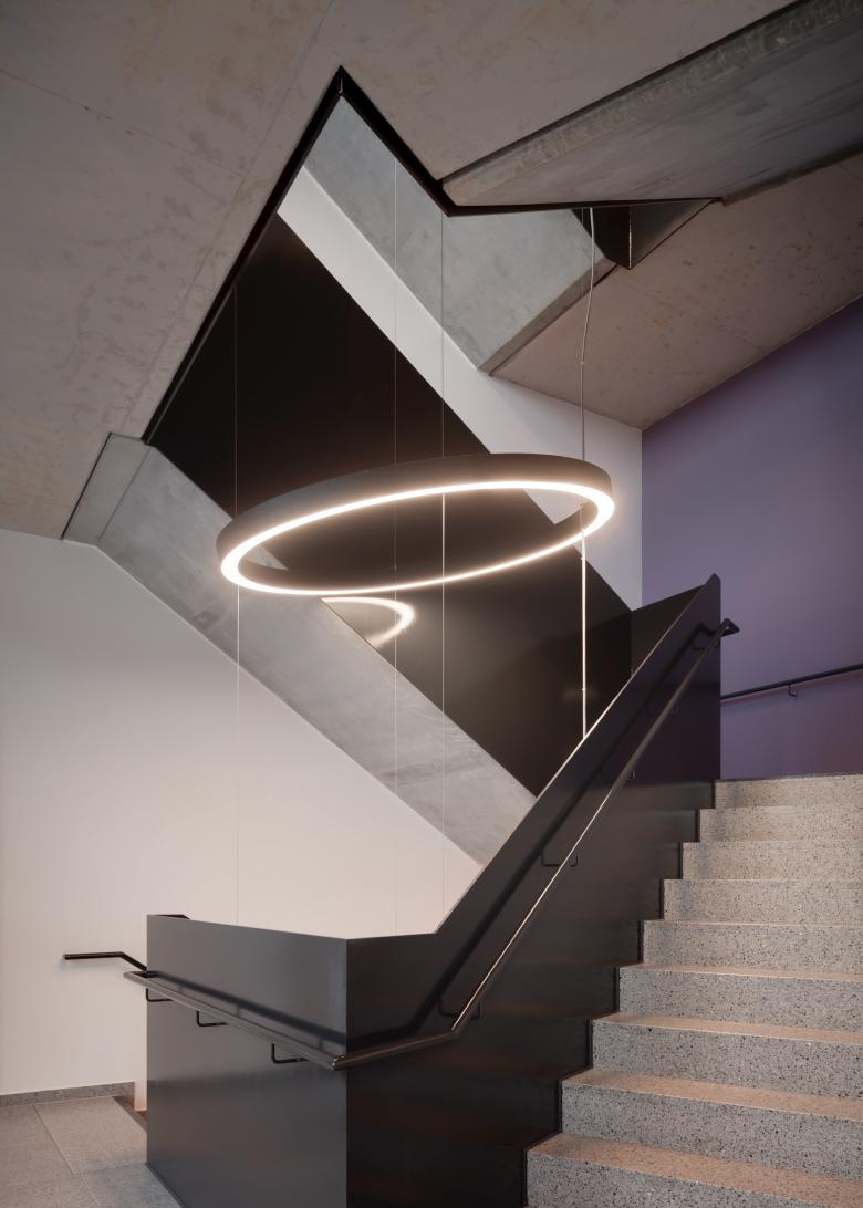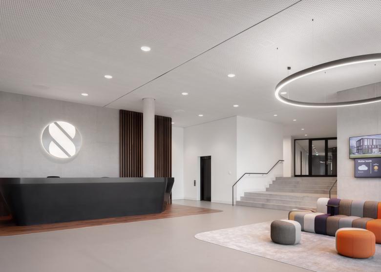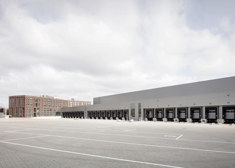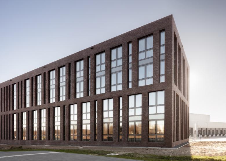 Die Fassade des Hochregallagers wird kontrastierend mit einer hellen Metallfassade ausgebildet, welche durch seine vertikale Akzentuierung gestalterisch eine Brücke zum angrenzenden Verwaltungsbau schlägt und den Baukörper gleichzeitig leicht und filigran erscheinen lässt. Der Bereich des Foyers wird mit großflächigen Fenstern zur Umgebung geöffnet. Raumhohe Fensteröffnungen sorgen für gleichmäßiges Tageslicht auf den Büroflächen.