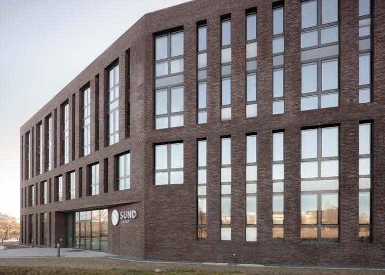 Im neu entwickelten Gewerbegebiet plant die Sund Holding einen neuen Firmensitz. Der Neubau besteht aus Büro- und Verwaltungszentrale sowie Lagerflächen in Form eines Hochregallagers. Die klassische Lochfassade des Verwaltungsbaus wird durch geschossweise, in der Breite variierende Fensterformate aufgelockert. Die mineralische, rote, hinterlüftete Vorhangfassade mit tiefen Fensterlaibungen verleiht dem Baukörper dabei die notwendige optische Stabilität, um sich neben dem Volumen des Hochregallagers zu behaupten.