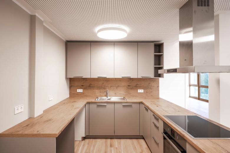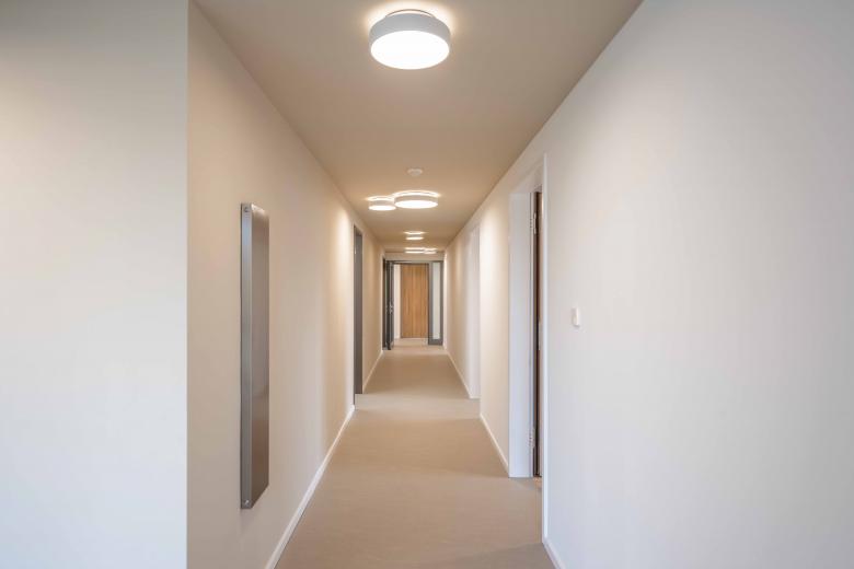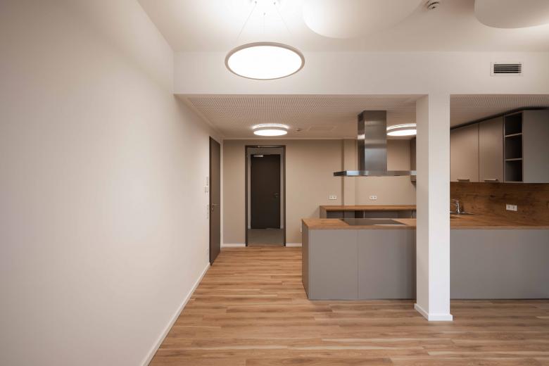 Die Situation der Bewohner wurde bei der Planung in besonderer Weise berücksichtigt: natürliche Materialien wie Holz und Pflanzen sowie gedeckte, warme Farben sollen den Heilungsprozess unterstützen und für ein besonderes Wohlfühlklima sorgen. Weite Blickachsen in die Natur und großflächige Verglasungen fördern das Gefühl von Freiheit und sorgen für viel Tageslicht. Ein Atrium mit Garten ermöglicht den Bewohnern den geschützten Gang nach draußen. Grüne Farbakzente in der Innenraumgestaltung sorgen zusätzlich für Ruhe und Wohnlichkeit.