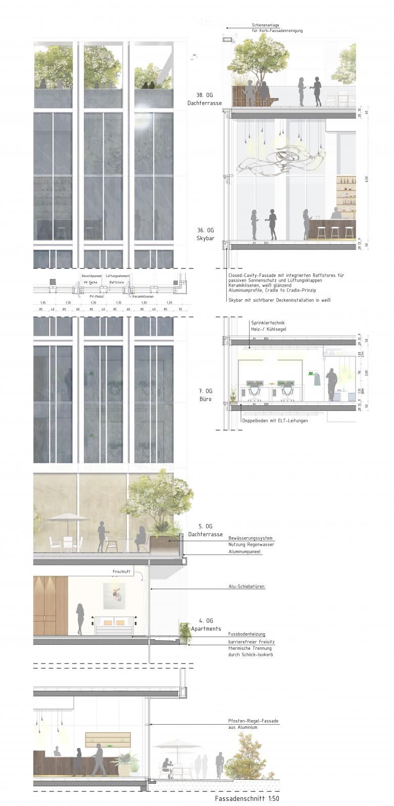 Das in der Höhe differenzierte Scheibenhochhaus orientiert sich mit seinem Volumen an der gewünschten 100 Meter Grenze der Stadt und setzt einen markanten Hochpunkt zum Niederländer Ufer in Köln. Dennoch reiht sich der Neubau auf dem ehemaligen Gelände des Parkhauses am Zoo städtebaulich in die umgebende Wohnbebauung ein und vermittelt zu den Höhen der umliegenden Hochpunkte entlang des Rheinufers. Dabei bleiben die wesentlichen Sichtachsen und der Raum zum Dom frei. Der Gebäudesockel wurde auf ein Mindestmaß reduziert, um einen landschaftlichen Raum als Verbindung zwischen Flora, Zoo und dem Rheinufer zu schaffen.