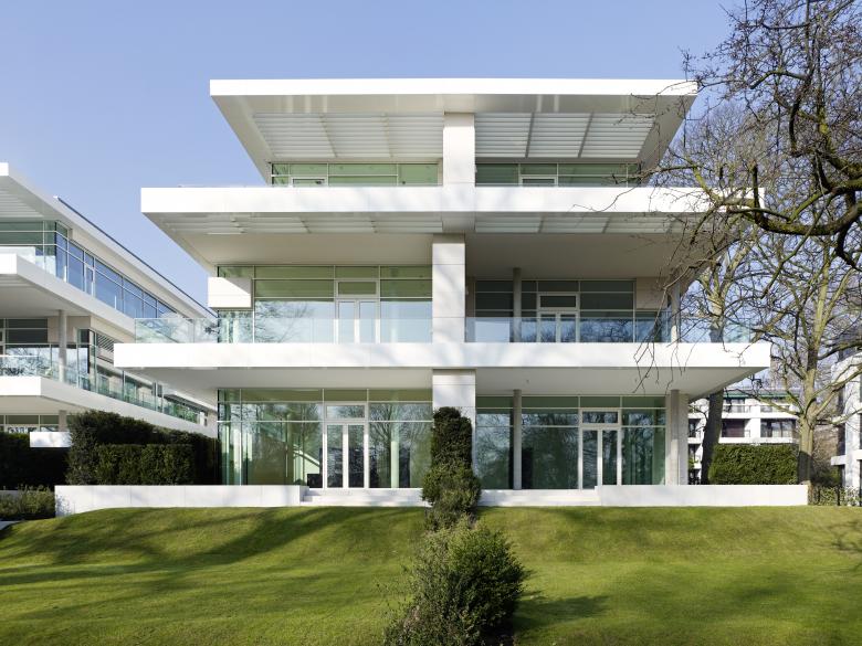 Die Besonderheit des Hamburger Stadtteils Harvestehude ist die ruhige, begrünte Lage am Alsterpark. Das Gebäudeensemble besteht aus zwei Stadtvillen sowie einem Parkpalais und verfügt über insgesamt 30 Wohneinheiten mit Größen zwischen 145 m² und 300 m². Kleinmaßstäbliche Bauteile gliedern das kompakte Volumen der drei Wohnbauten; Vor- und Rücksprünge in der Fassade sowie Dachabstufungen unterstreichen dabei ihre vertikale Ausrichtung. Die offene Bauweise lässt Innen- und Außenraum miteinander verschmelzen und erlaubt weite Blickachsen.