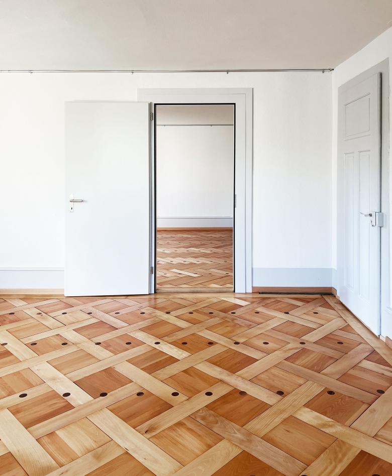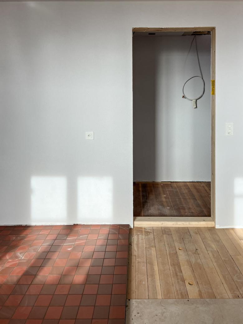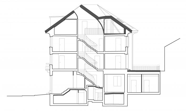 Das charakterstarke bestehende Treppenhaus wird zur wohnungsinternen Erschliessung der geschossübergreifenden Grosswohnung. Durch die Entfernung der ehemaligen Wohnungstüren und Trennwände zwischen dem Treppenhaus und den Wohnungskorridoren entsteht ein grosser räumlicher und atmosphärischer Gewinn. Mit dem neuen Dachfenster über der Treppe wird die Originalsubstanz noch besser zur Geltung gebracht.