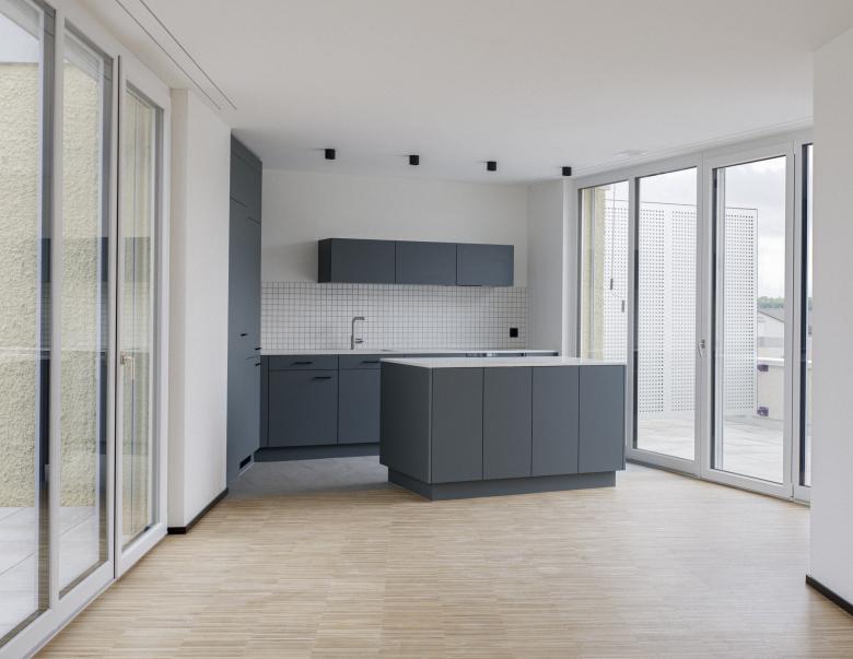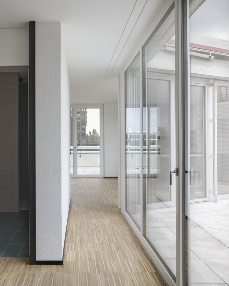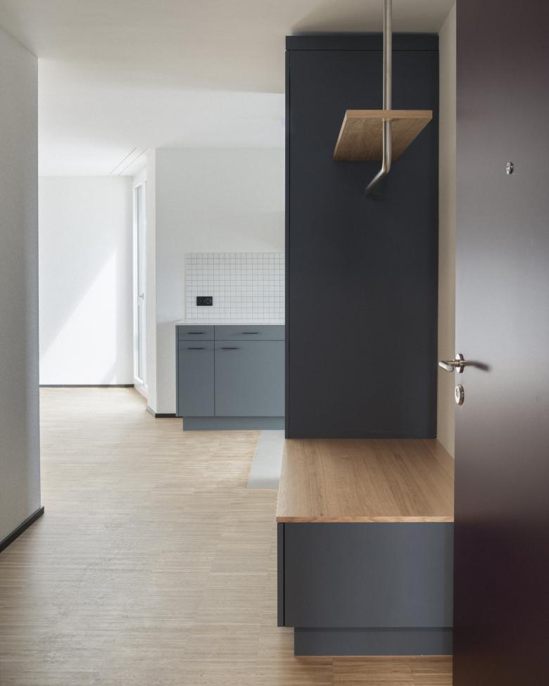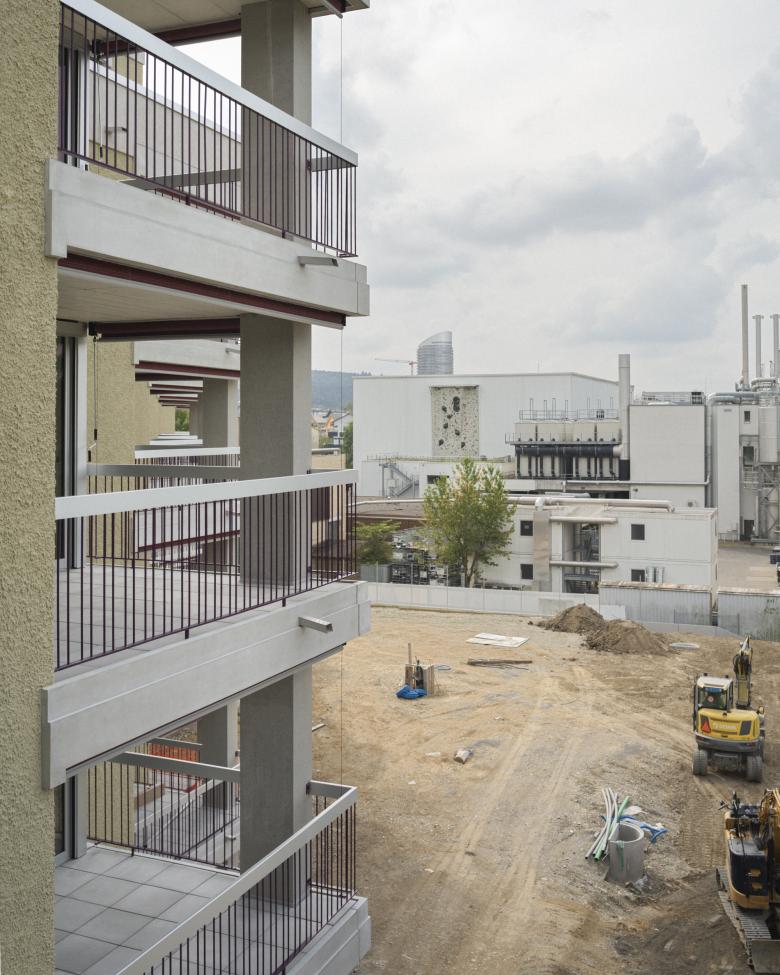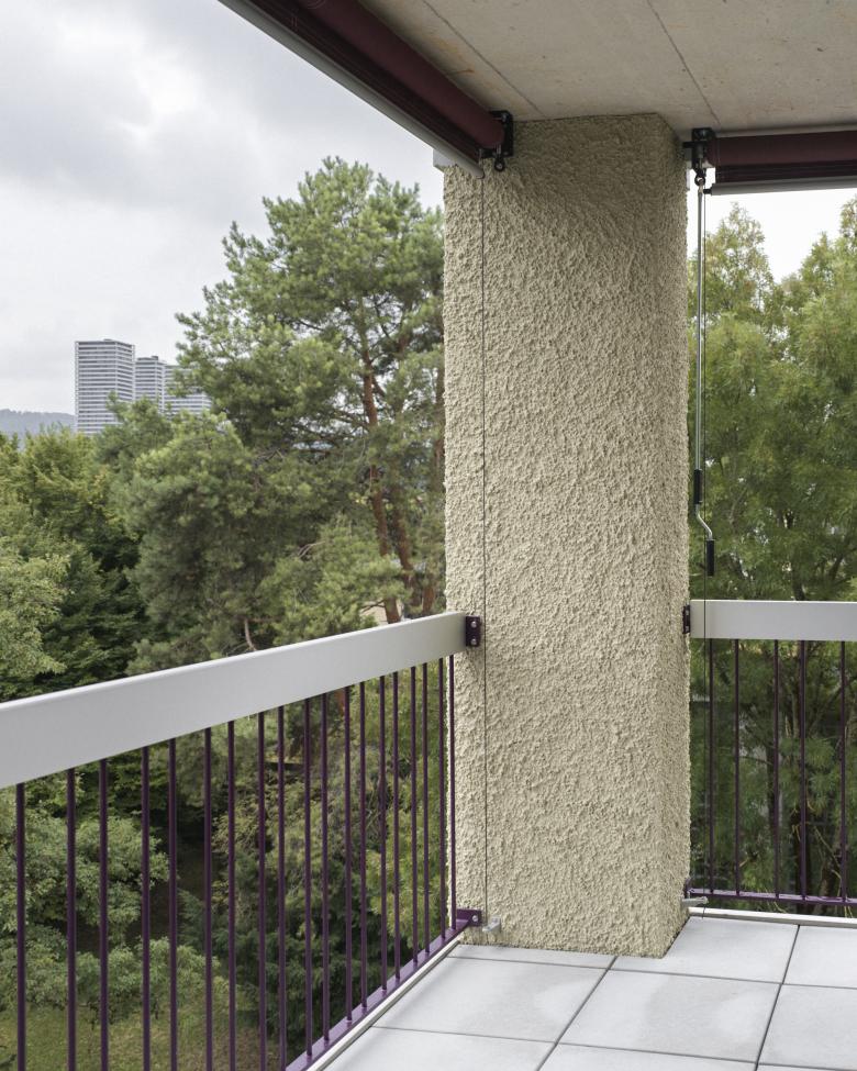 Alle Wohnungen sind mindestens dreiseitig orientiert: Die Hauptausrichtungen sind jeweils die Glatt im Norden und die Mittagssonne im Süden, durch die gestaffelten Fassaden öffnen sich die Wohn- und Aussenräume aber auch gegen Osten und teilweise gegen Westen.