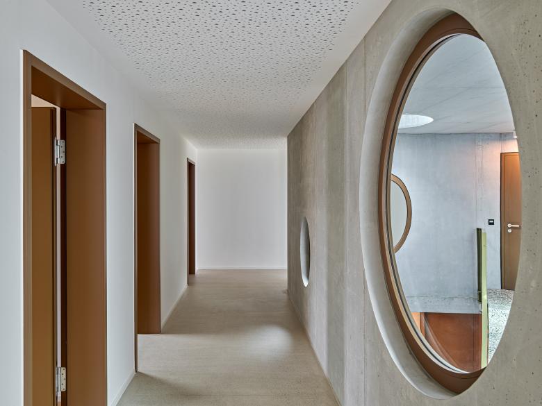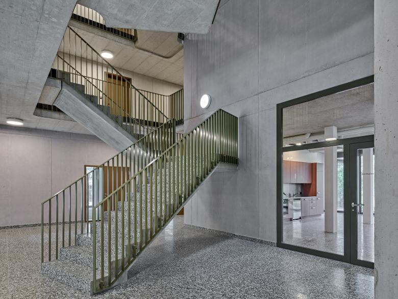 Das halböffentliche Erdgeschoss mit dem dazugehörigen, differenziert gestalteten Landschaftsraum bildet Ankunftsort und eine klare Adresse. In den dem Strassenraum zugewandten Raumschichten sind Nutzungen von öffentlichem Interesse wie Gruppenräume, Ateliers oder Cafés vorgesehen, die als Orte der Begegnung und des sozialen Austauschs dienen.