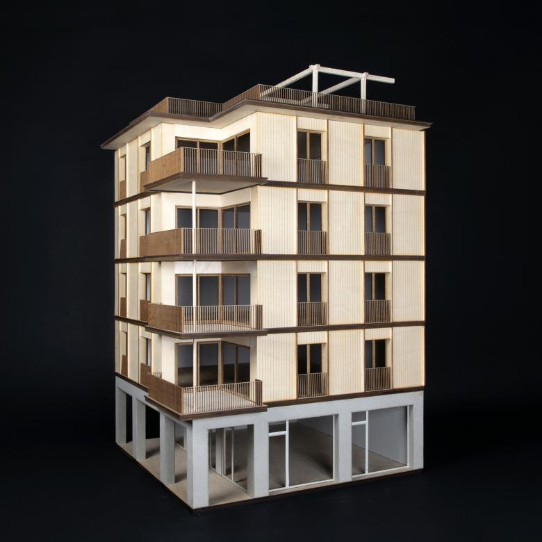 Der Ausdruck der Gebäude reflektiert die Anforderungen an zeitgemässe genossenschaftliche Wohnungsbauten mit besonderem Augenmerk auf eine kostengünstige und flexible Raumorganisation, einen hohen Gebrauchswert, niedrige Betriebs- und Unterhaltskosten und eine gute natürliche Belichtung. Das Projekt löst die technischen und programmatischen Ansprüche mit einer einfachen, vertikalen Stapelung und vorfabrizierter Holzhybridbauweise.