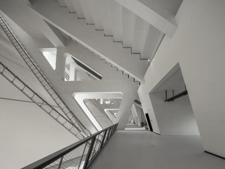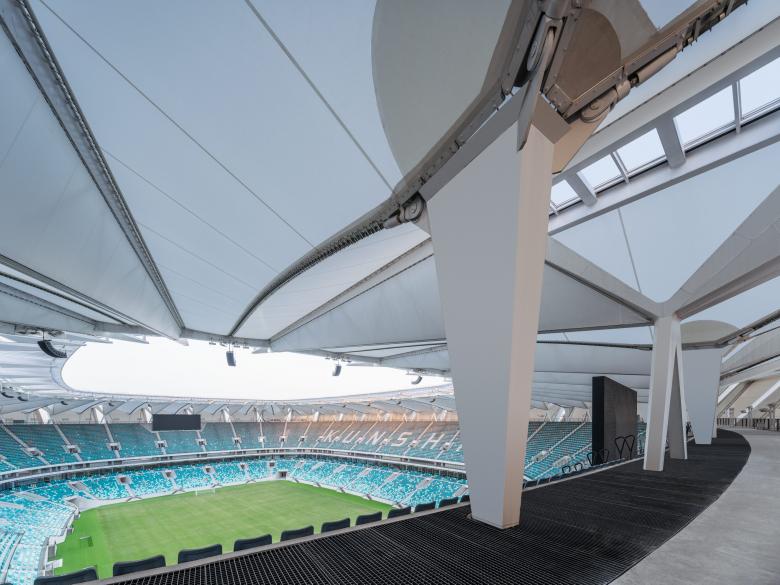 Die ovale Form des Stadions wird durch 36 robuste Doppelrahmen aus Ortbeton gebildet, die von filigranen Stahlfachwerkbindern überspannt werden. Das elegante skulpturale Tragwerk entstand in Kooperation mit schlaich bergermann partner (sbp). Zwischen den Doppelrahmen sind transluzente Membranen aufgespannt. Sie leiten Tageslicht ins Innere und fungieren zugleich als Fassade und Dachhaut. Mit einer Fläche von rund 600 Quadratmetern pro Membranelement handelt es sich um die größte einlagige Membranstruktur in China. Ein außenliegendes Brückensystem ermöglicht eine schnelle und reibungslose Erschließung: Breite Treppen führen die Zuschauenden auf ein umlaufendes Podium und von dort aus über 48 Brücken auf die oberen und unteren Ränge der Tribünen. Dass die Personenströme so effizient geleitet werden, wurde bereits beim Eröffnungsspiel erfolgreich unter Beweis gestellt.