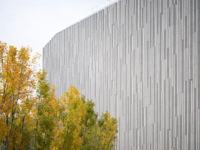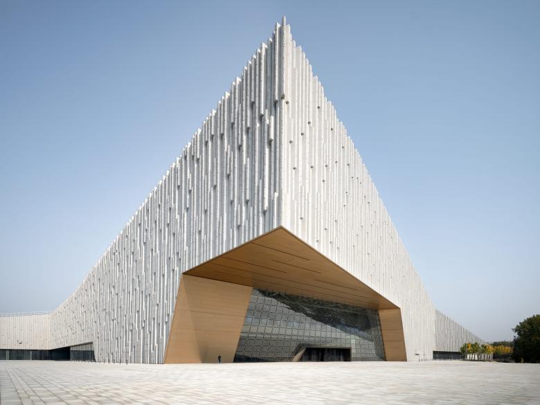 Die vertikal strukturierte Natursteinfassade des Gebäudes ist in modularer Bauweise aus vorgehängten, vorgefertigten Elementen konstruiert. Ihre reliefartige, rhythmische Struktur bildet abstrahiert den Verlauf des Flusses nach. Die öffentlichen Bereiche sind mit verglasten Lichtschlitzen versehen, während die Ausstellungsbereiche vor Lichteinfall geschützt sind. Drei großformatige Fenster an der Nordseite greifen das Motiv der Höhlen am Gelben Fluss auf und rahmen den Ausblick in die Landschaft.