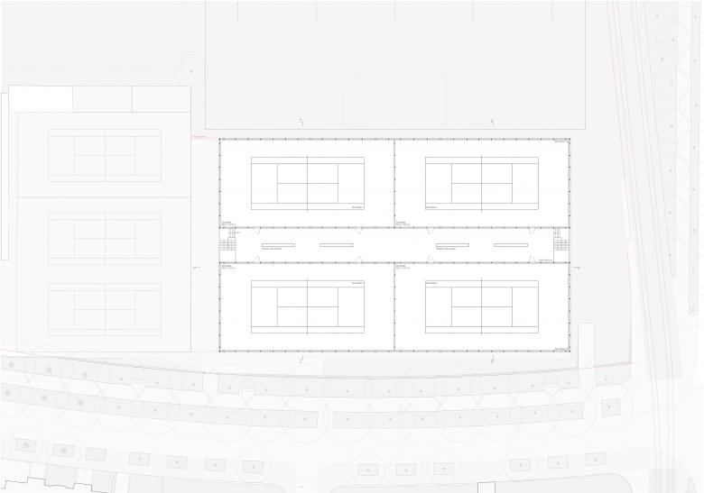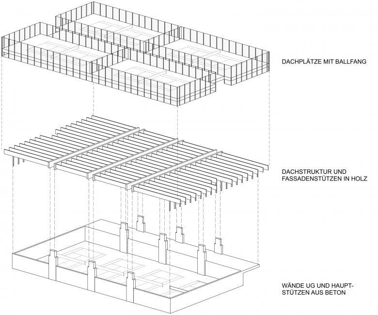 Die Dachplätze sind für eine optimale Nutzung analog zu den bestehenden Aussenplätzen ausgerichtet und mit einem 4 Meter hohen Maschendrahtzaun umfahren. Durch die Dachauskragung vergrössern sich die Aussenplätze zu regulären Turnierplätzen.