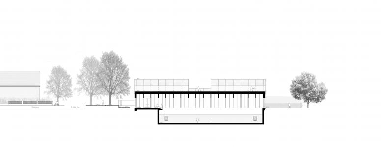Die Tragstruktur setzt sich aus einer Betonwanne im Untergeschoss und einem Dachholztragwerk zusammen. Im Erdgeschoss entsteht eine Überlagerung der beiden Systeme. Das Dachtragwerk überspannt die gesamten 35 m ohne Abstützung auf dem Hallenboden und erlaubt dadurch eine Nutzungsflexibilität.
