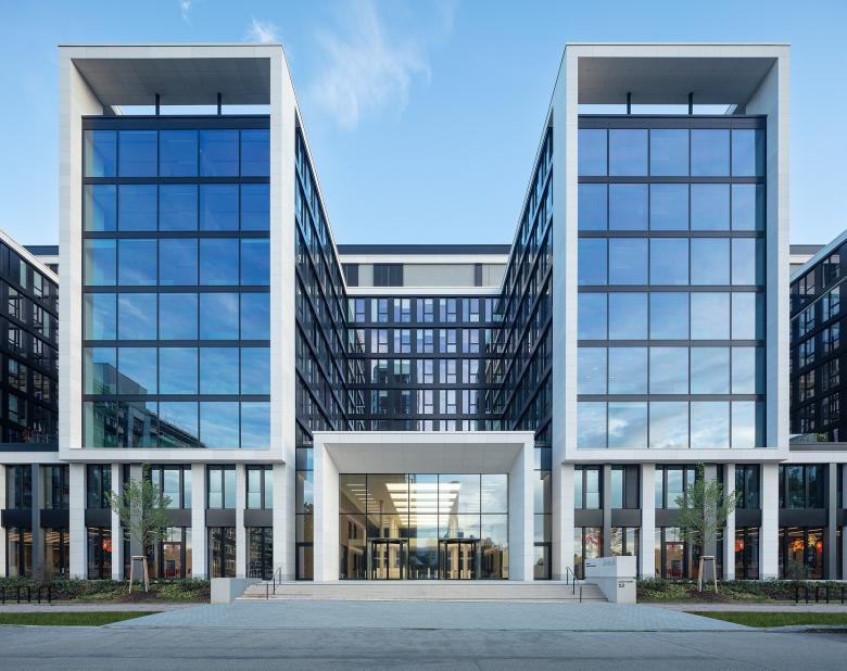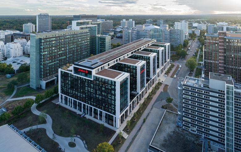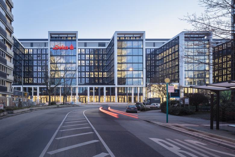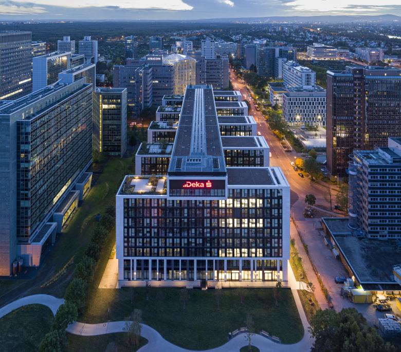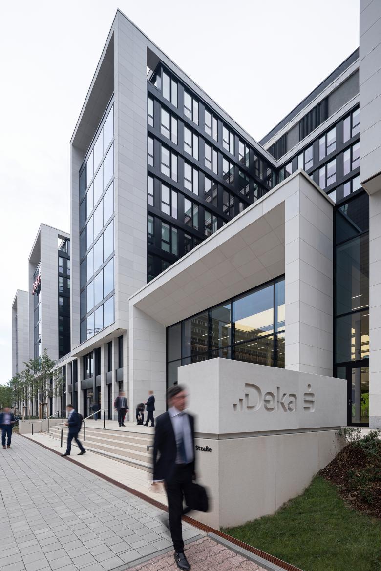 Der Neubau für die DekaBank an der Lyoner Straße in Niederrad ist mit rund 50.000 m² Bruttogeschossfläche ein zentraler Baustein in der Neuaufstellung des Wohn- und Büroquartiers und besetzt eines der Entrees zur Bürostadt mit seiner markanten und einladenden Architektur. Große Glasfassaden an den Stirnseiten der Büroriegel lassen weite Ein- und Ausblicke zu und hängen wie Monitore über einem zweigeschossigen Sockelgeschoss, das die Büroriegel miteinander verbindet. Die Fertigstellung ist für Ende 2022 vorgesehen.