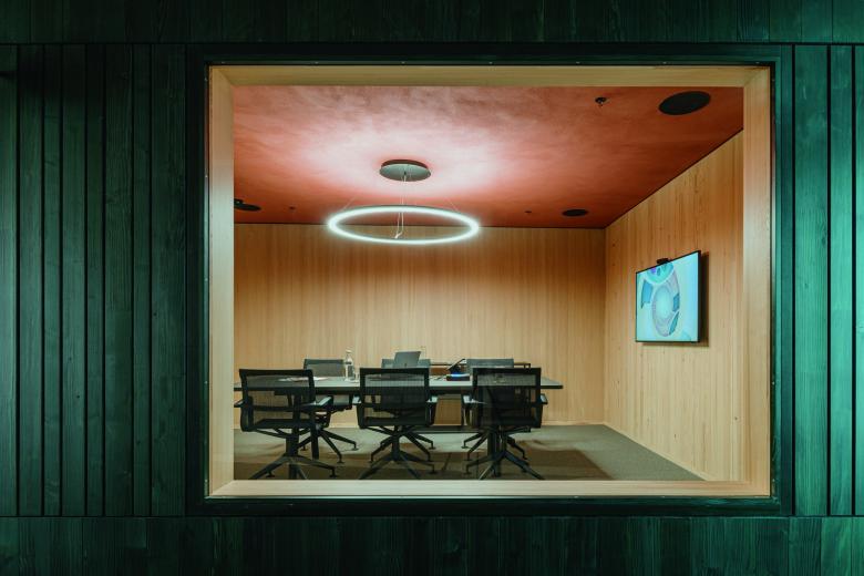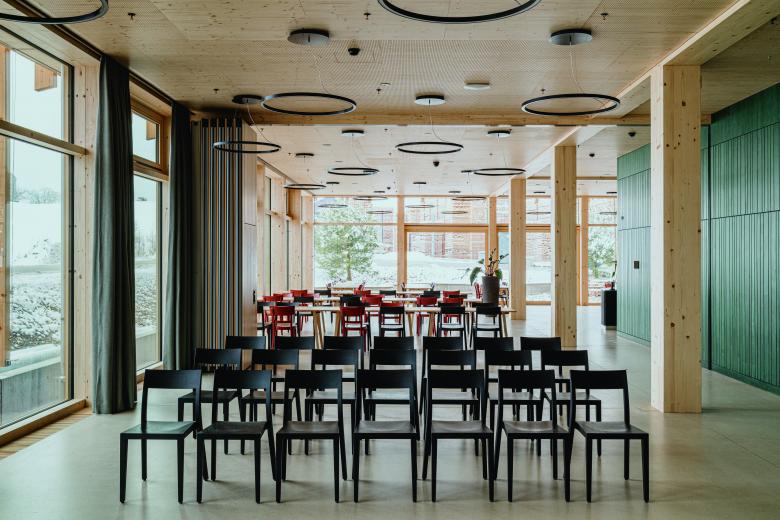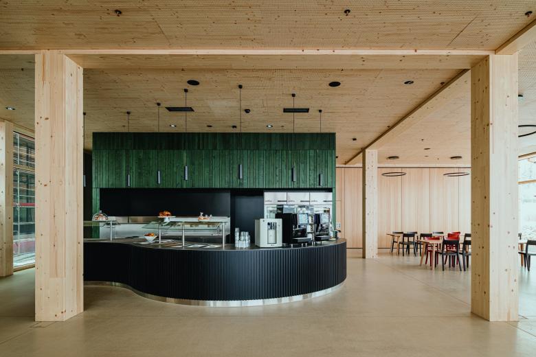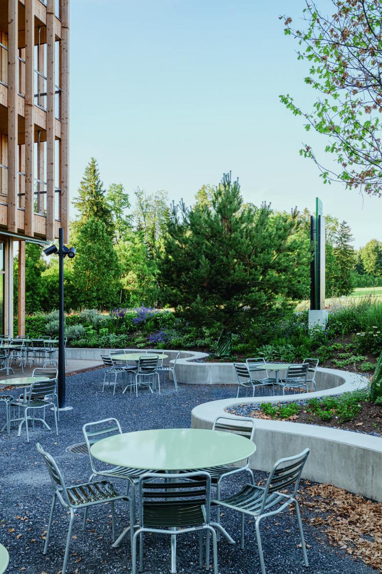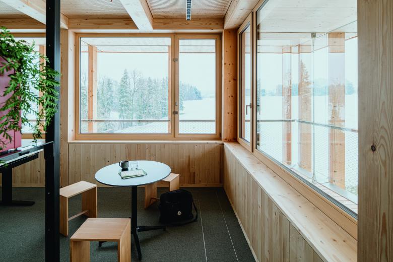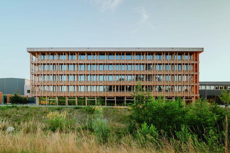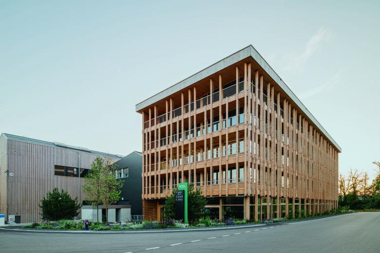 Bei dem Entwurf des Stammhauses ist es gelungen, moderne Ästhetik, ein attraktives Arbeitsumfeld und Prinzipien des passiven Holzschutzes und des nachhaltigen Bauens gestalterisch miteinander in Einklang zu bringen.