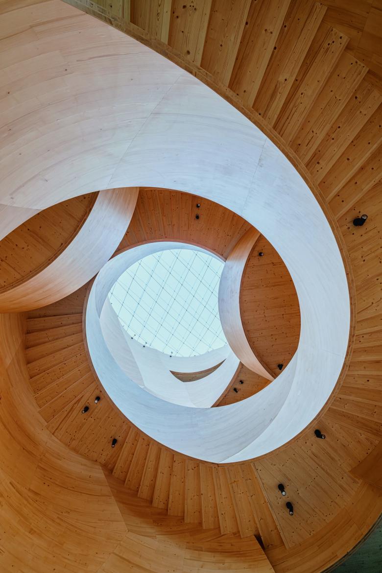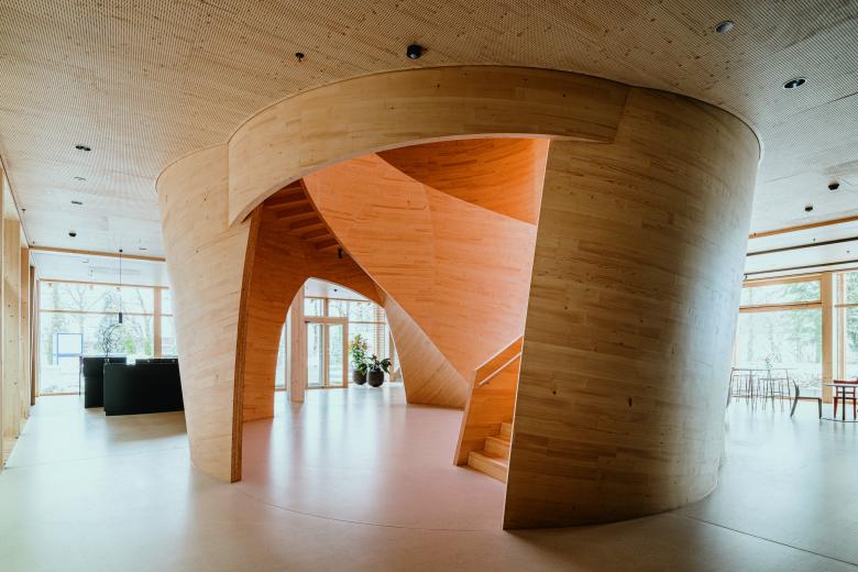 Das Empfangs- und Bürogebäude der Holzbaufirma Blumer Lehmann auf dem Erlenhof in Gossau im Kanton St.Gallen ist ein moderner Holzbau. Herzstück des fünfgeschossigen Gebäudes mit großer Eingangshalle, Veranstaltungsraum, Cafeteria mit Terrasse und 180 Büro-Arbeitsplätzen ist eine frei geformte Treppe, deren Form und Holzbautechnik gemeinsam mit dem Institute for Computational Design and Construction (ICD) der Universität Stuttgart entwickelt wurde. Gekrümmte Flächen aus Massivholzplatten bilden ihre Form. Ein rundes Oberlicht aus einem Folienluft-Kissen mit einem Durchmesser von 8,5 Metern lässt Tageslicht in das Treppenhaus fallen. Das Pendant zum runden Atrium bildet ein grün verkleideter Kern, der neben einem massiven Fluchttreppenhaus auch Besprechungszimmer und Nebenräume umfasst und die offenen Geschossflächen strukturiert.