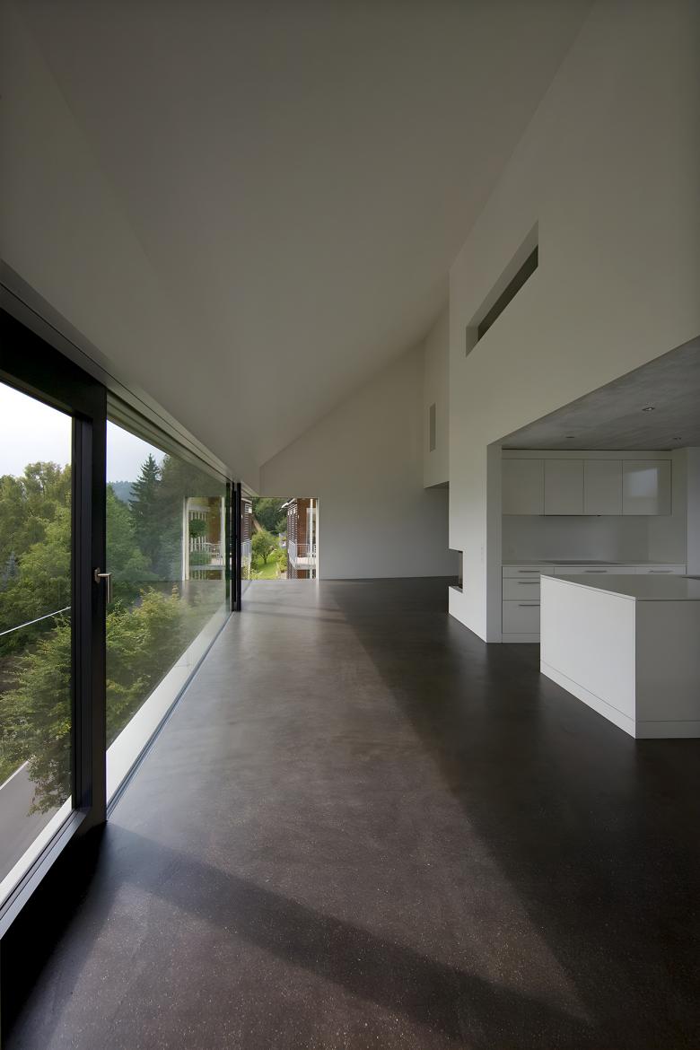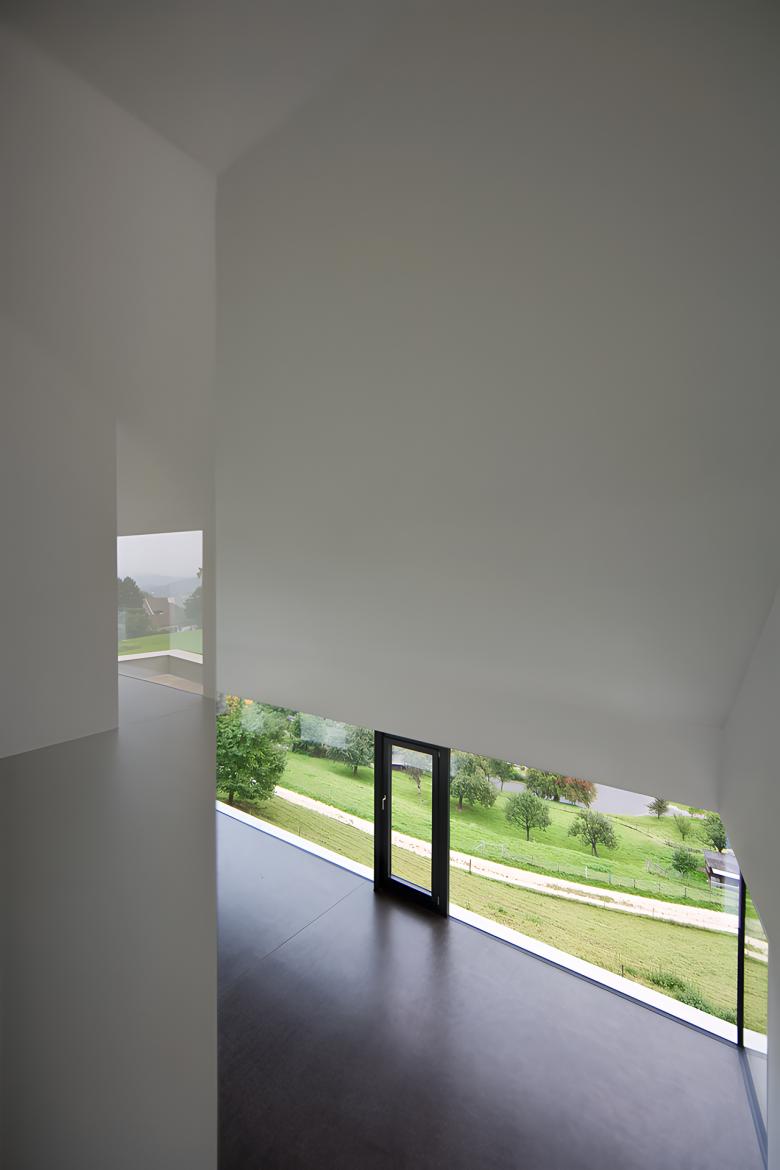 Der architektonische Entwurf der beiden Hausteile nimmt die einzigartige Panoramalage sowie den historischen Bezug zum Burgstädtchen Regensberg auf und übersetzt diese Qualitäten in eine zeitgemässe Formsprache. Jeweils drei Wohnungen pro Haus zeichnen sich durch individuelle Grundrisse, Höhenstaffelungen und Proportionen aus, wobei das Wohnzimmer als zentrales Element mit einer Raumhöhe von 3,4 Metern und raumhohen Verglasungen nach Süden beeindruckt. Ein spannungsvolles Wechselspiel entsteht durch die Kontraste zwischen den verwinkelten, „burgig“ anmutenden Privaträumen und den lichtdurchfluteten, grosszügigen Wohnbereichen. Die konsequente Anwendung von Höhenversätzen ermöglicht in den Dachwohnungen vertikal orientierte Raumkonzepte, bei denen die Zimmer halbgeschossig zum Wohnraum versetzt sind. Während die südseitigen, teils übereck verglasten Bandfenster eine spektakuläre Weitsicht bieten, zitiert die „burgige“ Nordfassade mit schmalen, „Schiessscharten“-artigen Fenstern die historische Architektur Regensbergs und sorgt für eine harmonische Einbindung in das Ortsbild.