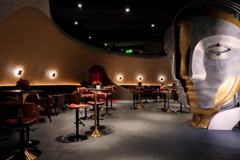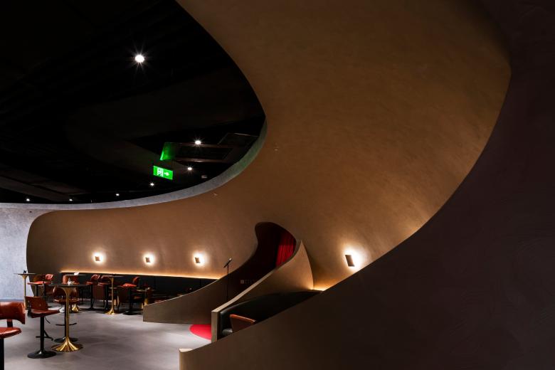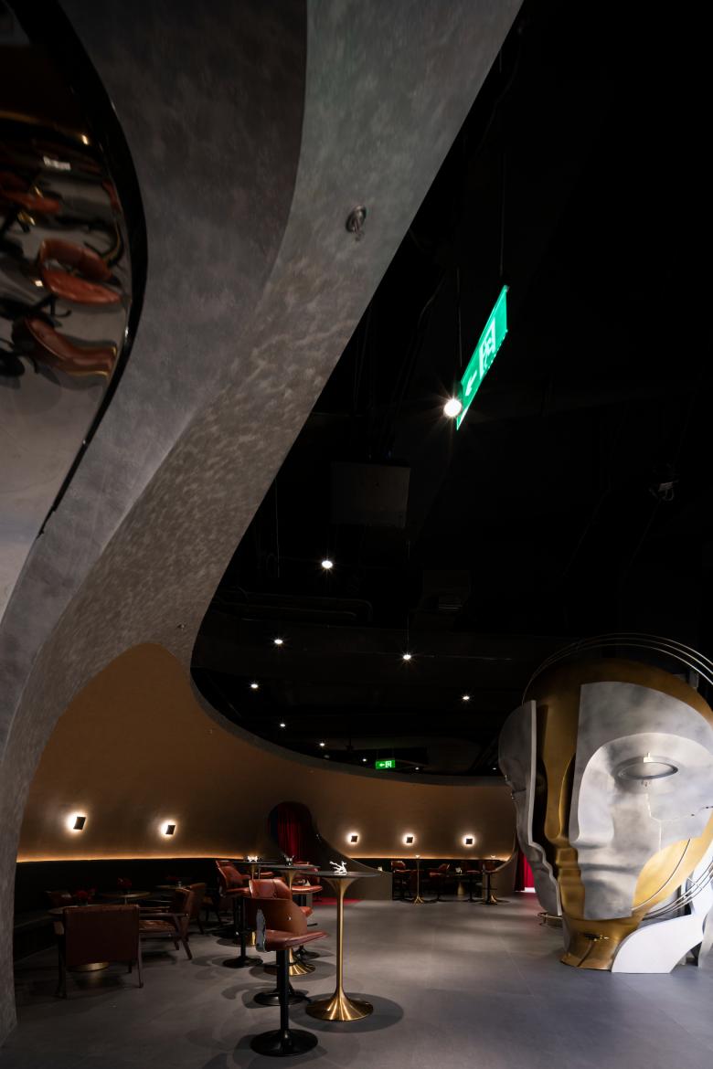 项目位于上海市浦东区前滩31乐荟商圈,整体室内面积880平方米。包含酒吧、轻餐、剧社、剧场等多重复合功能。在唯因万境,剧场与酒吧是戏与酒的交叉赋能。舞台与吧台打破传统界限,不必是平铺直叙的两个空间,通过非线性动线、灯光与结构设计——就如同戏剧讲究通过剧幕结构的编排、布景与灯光的变化来交代情节的与角色的转换一样,赋予空间起承转合的戏剧性,构建出一个环形的叙事空间,将分离的角色、事件、场景重新组织,让观众与演员共同编织故事,模糊观演边界。