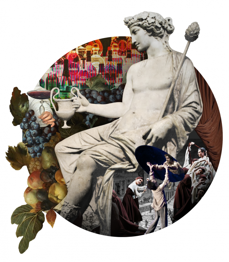 古希腊人视酒为现实与精神的纽带,是满足物质需求之余,从生存的劳作中暂时解放的灵药。根据亚里士多德记载,希腊人每年都会通过畅饮、高歌、舞蹈及象征意义的庆典以祭祀酒神狄俄尼索斯——葡萄收获与酿酒之神。戏剧便源于酒神庆典中的歌舞表演。