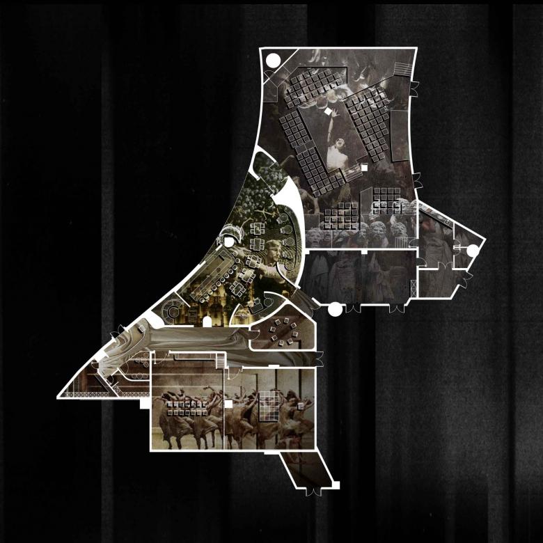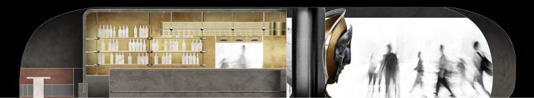 除了剧场与酒吧的属性,唯因万境还包囊了轻餐及剧社工作室的功能。剧场、酒吧、工作室,在空间与时间的组织上镶嵌交错,按人群的动态特征,将学习、体验、表演、观影、餐饮、小酌等功能,由主界面向内依次排布,同时利用流动的通道将三个板块沟通串联,使得不同动机的角色在空间中得以灵活地穿行,角色之间的对话互动也更加有机自然。