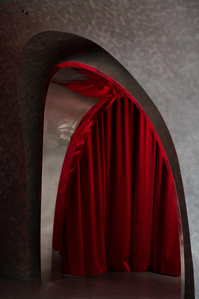 开幕前,入口幕布打开,观众可进入酒吧享受闲暇时光的一杯小酌,演员则在剧社进行创作、排练,剧场内则进行着设备调试与场地布置。随着暗示“即将开演”的幕布落下,以装置艺术为引导,观众开始通过拱形隧道进入主空间,穿行在细长的前场通道内,昏暗的灯光,朦胧的幕布与肌理,都在一步步过渡、削减观众对外部商场的空间感知,使其从现实世界逐步剥离,沉浸于曲线与光影交织的“洞穴”中。