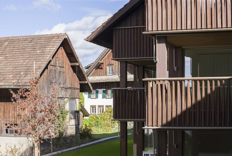 Innerhalb des engen Korsetts der kommunalen Kernzonen-Bauvorschriften integriert das Projekt viele traditionelle Elemente wie die Dachneigung und den Schleppdachknick, die weit ausladenden, schlanken Vordächer oder die Fensterformate. Im Vorbeigehen sollen die Häuser den Eindruck erwecken, als hätten sie schon immer dort gestanden. Bei näherer Betrachtung sollen sie jedoch eindeutig als zeitgenössische Architektur erkennbar sein.