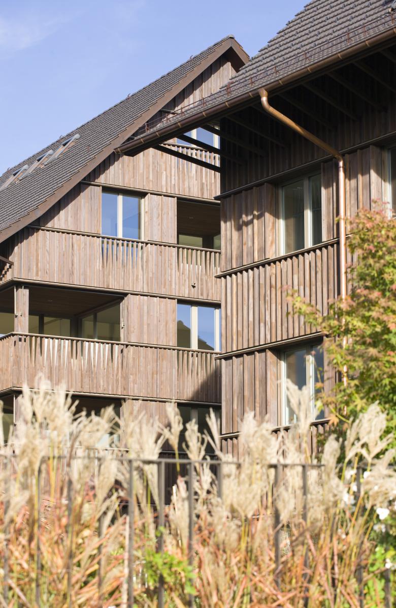 Die aus 15 Wohnungen bestehende Überbauung liegt an der Hauptstrasse in Mettmenstetten, flankiert den südlichen Ortseingang und befindet sich in unmittelbarer Nähe der Kirche. Gemessen an den Nachbargebäuden im historischen Dorfkern ist das neue Bauvolumen relativ gross. Das Programm ist daher auf zwei Gebäude aufgeteilt, die sich zudem durch ihre artikulierten Volumen sensibel in die kleinteilige Umgebung einpassen.