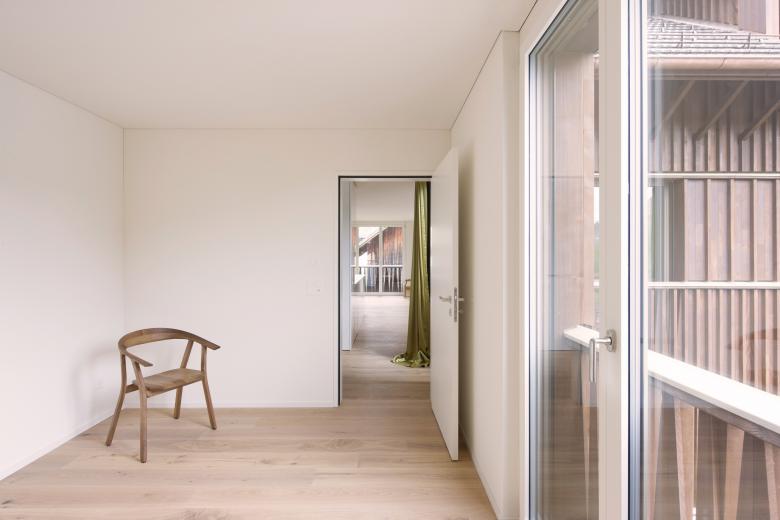 Ähnlich wie die Häuser sind auch die Wohnungen im Wesentlichen gleich, doch ihre Grundrisse sind auf ihre jeweilige Position im Gebäude zugeschnitten. Sie verfügen über z-förmige Wohnbereiche und vierseitige Ausblicke. Auf der Südseite sind quadratische Loggien über Eck in das Gebäudevolumen eingeschnitten. Von innen handelt es sich um durchlässige, offene Aussenbereiche, während sie von aussen eher geschlossen wirken und so eine ruhige Gebäudehülle wahren, sodass sich die Häuser diskret in den historischen Dorfkern mit seinen einfach geschnittenen Gebäudevolumen einfügen.