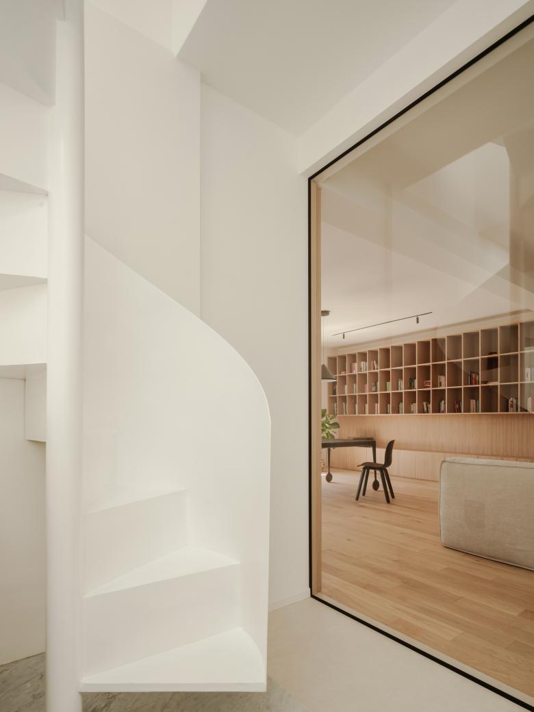 L’elemento a chiocciola ridisegnato come un esile velo di metallo, è il punto culminante del sistema, si inserisce nello spazio del living come un vero oggetto d’arredo, separato da una parete in vetro che lo isola e al tempo stesso lo mette in scena. Una boiserie con ante attrezzate completa il sistema, funzionando come un grande “iper-mobile” che contiene le connessioni verticali e gli spazi di servizio.