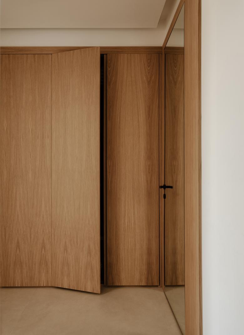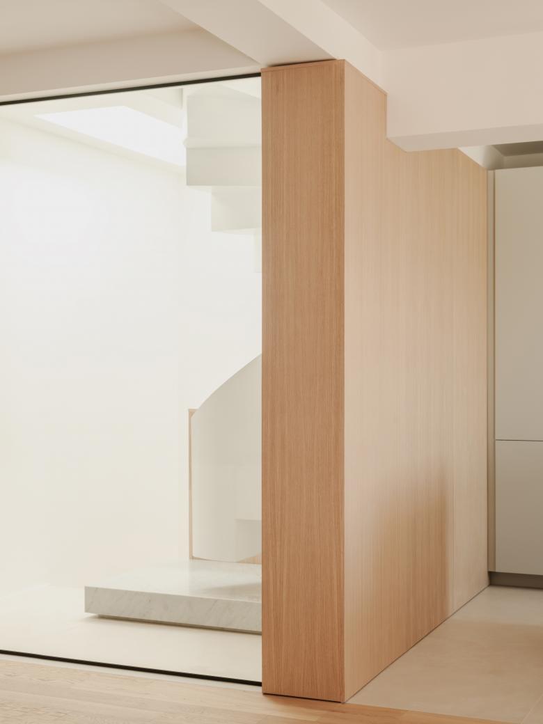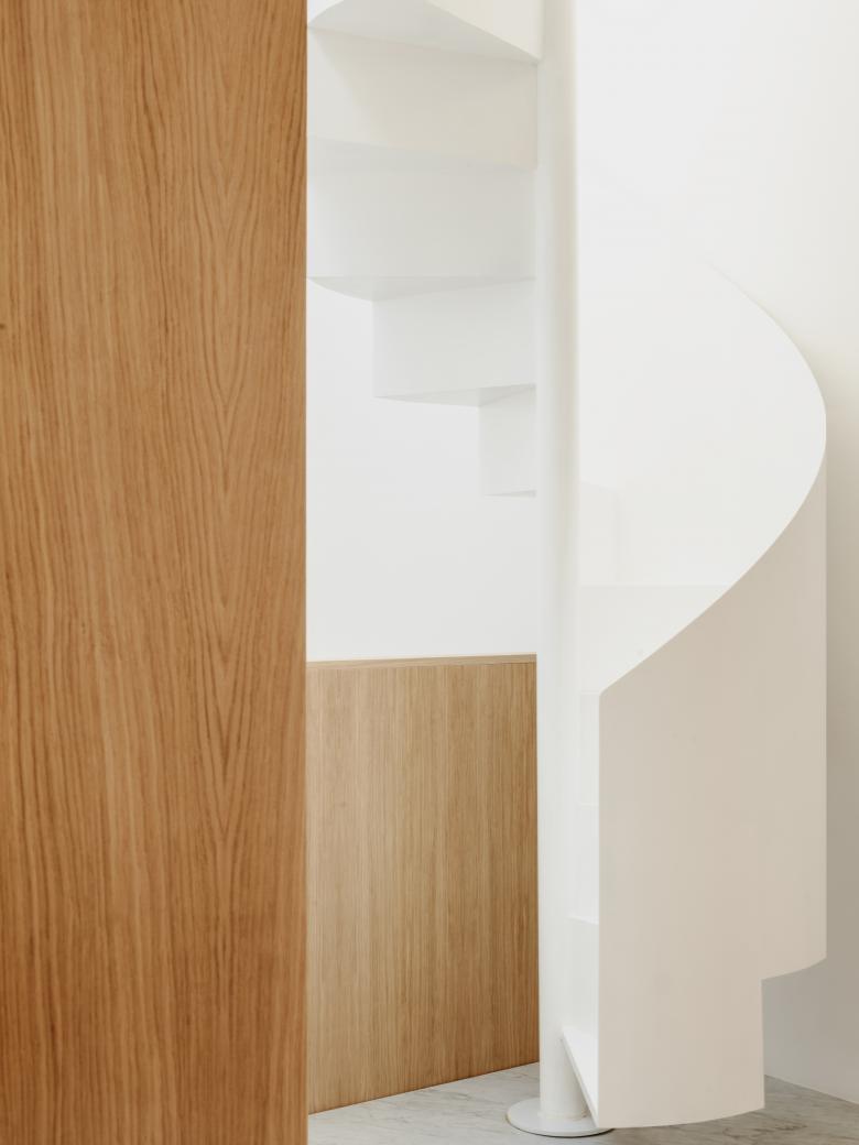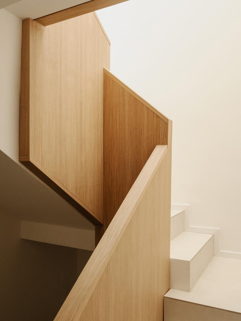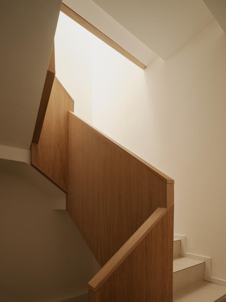 La scala, vera protagonista dello spazio domestico, attraversa verticalmente l’intero edificio come una “promenade” architettonica, illuminata da una luce zenitale che ne esalta la presenza. Nella sua composizione alterna materiali e percezioni: un primo tratto in lamiera forata bianca, leggera e quasi sospesa, lascia progressivamente spazio a un rivestimento in legno di rovere che ne accentua la matericità e il calore.