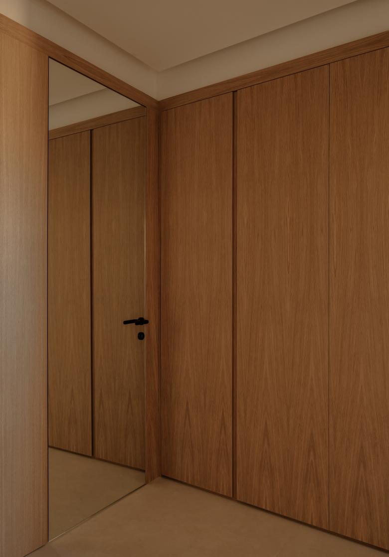 A completamento del living, un arredo su disegno in legno di rovere, composto da un elemento basso contenitivo e da una libreria sospesa, diventa il fulcro visivo e funzionale dell’ambiente, espressione del desiderio del committente di coniugare calore materico e ordine formale.