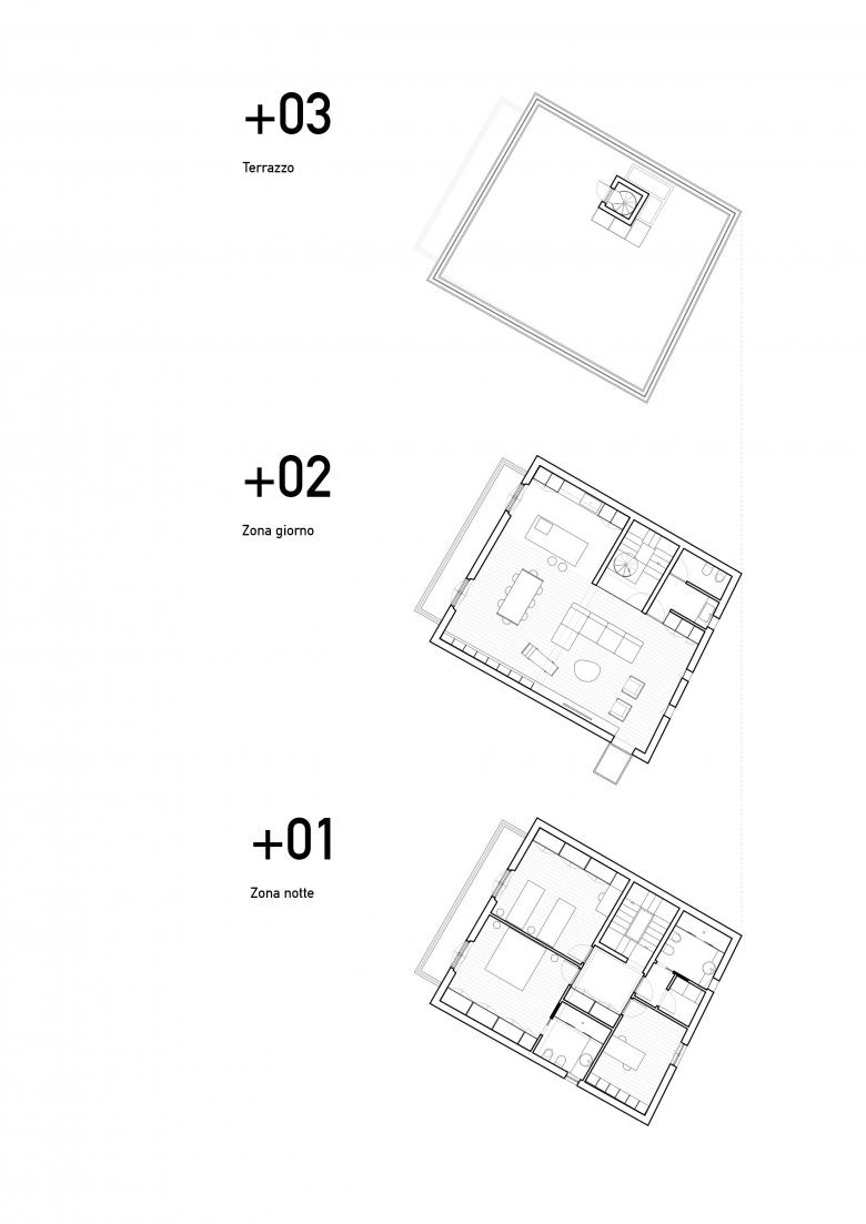 L’organizzazione funzionale si sviluppa in sezione, attorno al ridisegno della scala esistente in muratura, divenuta l’elemento centrale e identitario del progetto. Al piano inferiore trova posto la zona notte, con due camere da letto, uno studio e i servizi. Il livello superiore, più luminoso e affacciato sulla campagna siciliana, ospita la zona giorno in un unico ambiente open space che integra living e cucina. Da qui, una scala a chiocciola conduce al terrazzo, pensato come estensione all’aperto della casa.