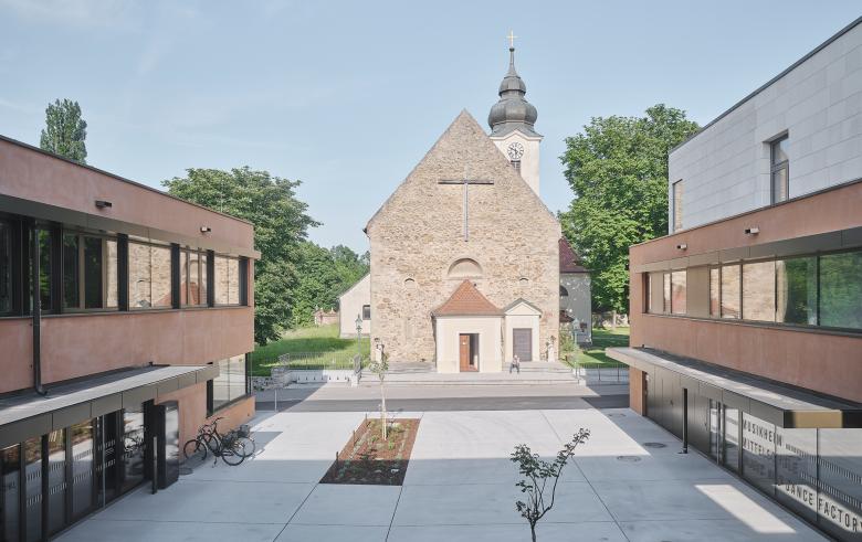 Am westlichen Ende des neu geschaffenen Kirchenvorplatzes findet sich das Heimatmuseum mit darüberliegendem Probesaal als Klangbox wieder. Ein für alle Funktionen zur Verfügung stehendes Stiegenhaus angrenzend an die NMS wird im südlichen Baukörper untergebracht.
