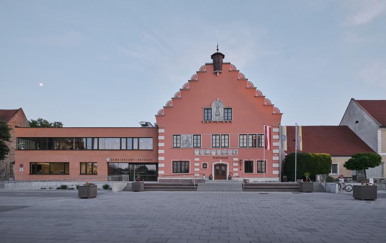 Das bestehende innerdörfliche Ensemble zwischen Rathaus, den Proberäumen der Musik, dem Heimatmuseum und der neuen Mittelschule wird in seiner städtebaulichen Konfiguration zur Pfarrkirche hin geöffnet. Dadurch wird ein neuer attraktiver, verkehrsberuhig­ter, zum Verweilen einladender Marktplatz geschaffen, welcher im Zusammenspiel mit dem Rathaus- und Goethe Platz eine neue Identität im Ort erzeugt.