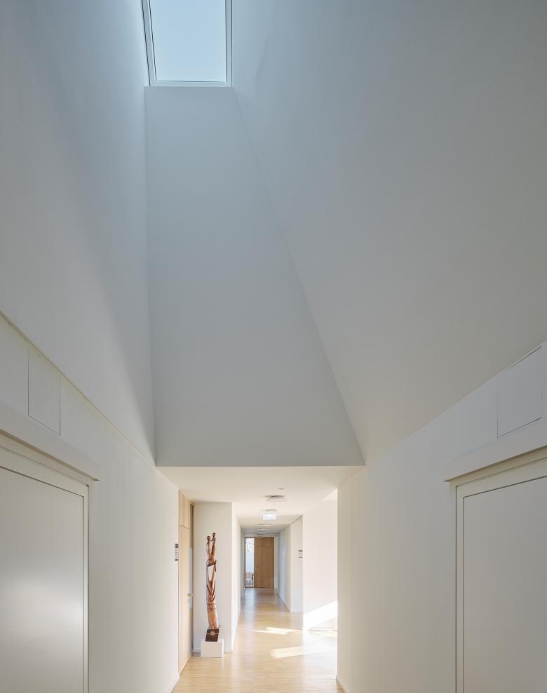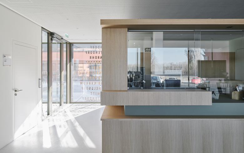 Der im Erdgeschoss angesiedelte Gruppenproberaum kann über ein Panoramafenster zum Vorplatz hin geöffnet werden und bietet somit weitere Synergie Aspekte bei Kirchen-, Schul- oder Markt-Feierlichkeiten.