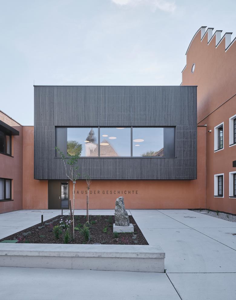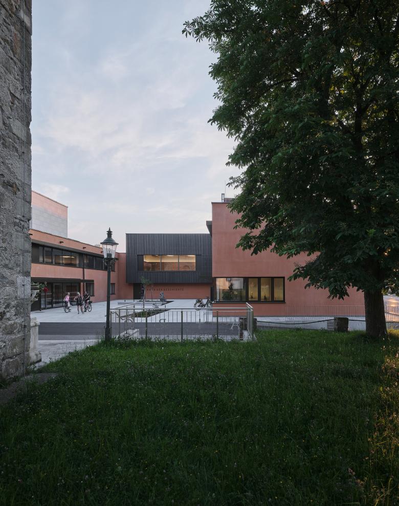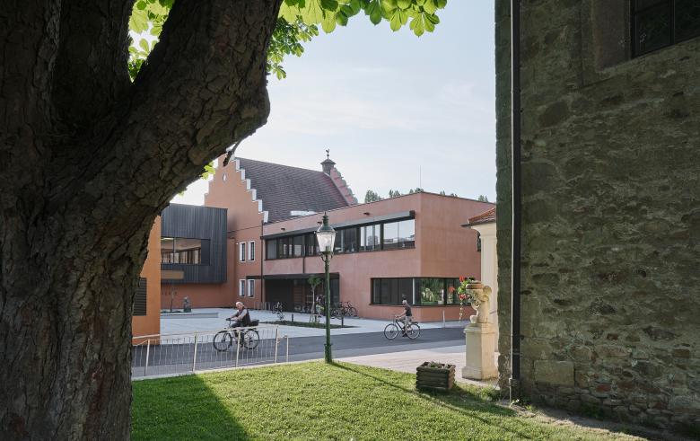 In ihrer Höhe gleichen sich die Zubauten an die angrenzende Bebauung an und fassen durch ihre einheitliche Materialität einen neuen Vorplatz zur mar­kanten vis-a-vis liegenden, steinernen Pfarrkirche.