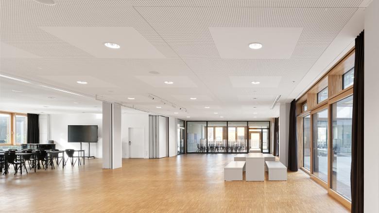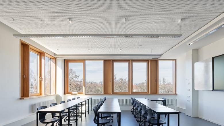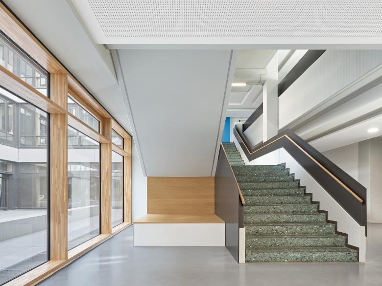 Ein Fokus der Sanierung lag auf der energetischen Ertüchtigung: Neue Fassaden mit Dreifachverglasung, begrünte Dachflächen, außenliegende Raffstores und eine integrierte Nachtauskühlung verbessern nachhaltig das Raumklima – ganz ohne mechanische Lüftung. Innen sorgen langlebige Materialien und eine robuste Ausstattung für eine dauerhafte Nutzung im schulischen Alltag. Die Unterrichtsräume wurden medientechnisch modernisiert und akustisch optimiert.