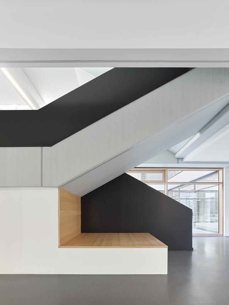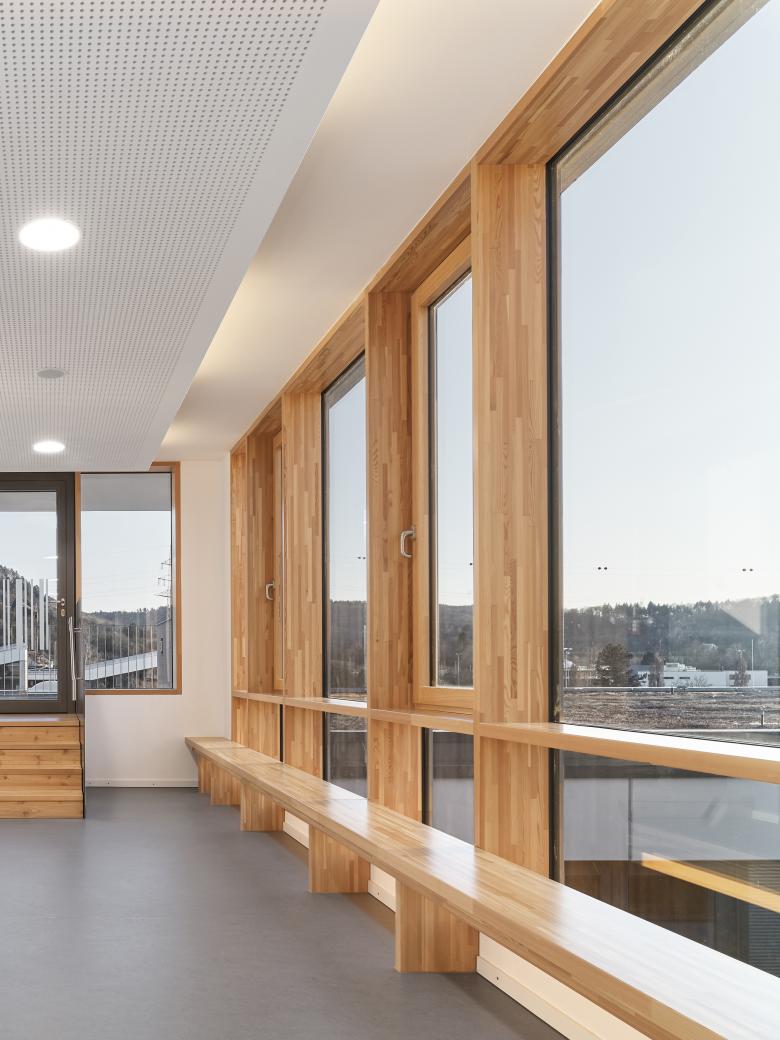 Innen jedoch wurde vieles neu gedacht: Unterrichtsräume wurden vereinheitlicht, Fachbereiche neu strukturiert, das Foyer geöffnet und als kommunikativer Ort formuliert. Materialien wie Lärchenholz, Linoleum und Sichtbeton treten in einen zurückhaltenden Dialog.