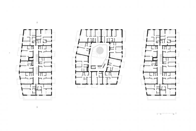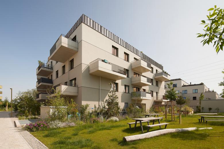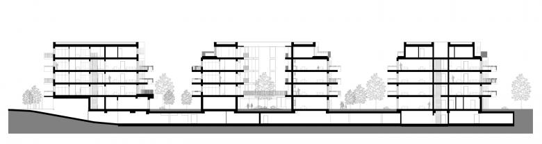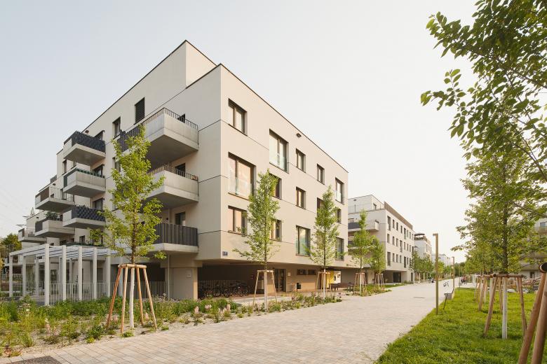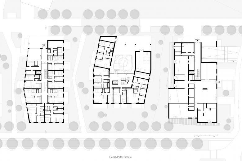 Wohnungen, Gemeinschaftsflächen und zugeordnete Freiflächen gewährleisten eine belebte Erdgeschoßzone. In den Terrassenhäusern (Bauteil 1 und Bauteil 3) führen kaskadierende Treppen durch das großzügig belichtete Treppenhaus nach oben. Lufträume ermöglichen Blickbezüge und visuelle Verbindungen. Das Atriumhaus (Bauteil 2) wird über das offene, begrünte Atrium erschlossen. Der Baukörper ermöglicht darüber hinaus durchgesteckte und querlüftbare Wohnungen. Die Begrünung im Erdgeschoß sorgt dabei für ein angenehmes Mikroklima.