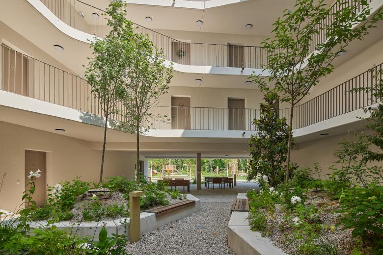 In beiden Bautypen wurde die Erschließung hinsichtlich der Vermeidung reiner Nord-Wohnungen optimiert. Das Erdgeschoss bildet die Drehscheibe des sozialen Zusammenlebens und verwebt Architektur und Außenraum. Neben den Wohnungen und deren notwendigen Wohnfolgenutzungen (Müllraum, Kinderwagen- und Fahrradraum) werden im Erdgeschoss ein Gemeinschaftsraum und eine Fahrradwerkstatt angeboten, welche sich zur Esplanade hin orientieren. Darüber hinaus ist in Bauteil 1 ein Kindergarten untergebracht, welcher nicht nur einen Mehrwert für die Bewohner:innen, sondern auch für das gesamte Areal und dessen Nachbar:innen darstellt. Das begrünte Atrium in Bauteil 2 ladet darüber hinaus als Begegnungszone zum Verweilen und Kennenlernen ein. Die erweiterte Laubengangfläche im 1.OG bietet zusätzlichen Raum zur Interaktion und Kommunikation der Bewohner:innen. Zusätzlich holt der Gemeinschaftshof in der Mitte des Atriums nicht nur den angrenzenden Grünraum in die halböffentliche Zone, sondern stellt mit seiner Bepflanzung einen wichtigen identitätsstiftenden Mehrwert für die Bewohner:innen dar.