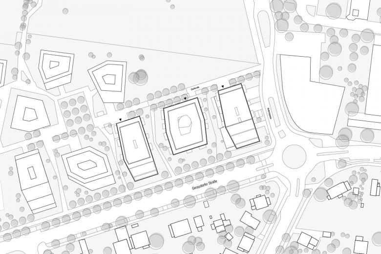 Der Masterplan - entwickelt von unseren Kolleg:innen „Shibukawa Eder Architects“ - bildet den übergeordneten Rahmen für das Gebiet Hirschfeld. Basierend auf der Flächenwidmung unterteilt sich das Grundstück an der Gerasdorfer Straße in vier Baufelder. Diese wiederum sind klar in zwei Gebiete mit unterschiedlichen Anforderungen zoniert - die lautere südliche Zone an der stark befahrenen Straße und die ruhigere nördliche Zone, angrenzend an das Waldgebiet entlang der Sowinetzgasse. Unser Baufeld findet sich an der Gerasdorferstraße und umfasst 2 Typologien, die im Masterplan entwickelt wurden – 2 Terrassenhäuser, die sich zur Gerasdorferstraße hin abtreppen, um auf die gegenüberliegende Bebauung zu reagieren und ein Punkthaus mit innenliegendem Atrium.