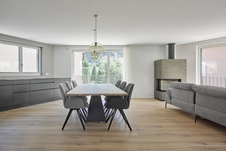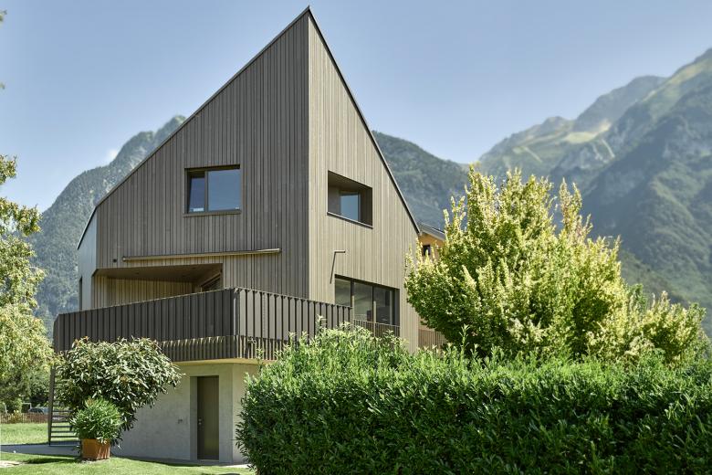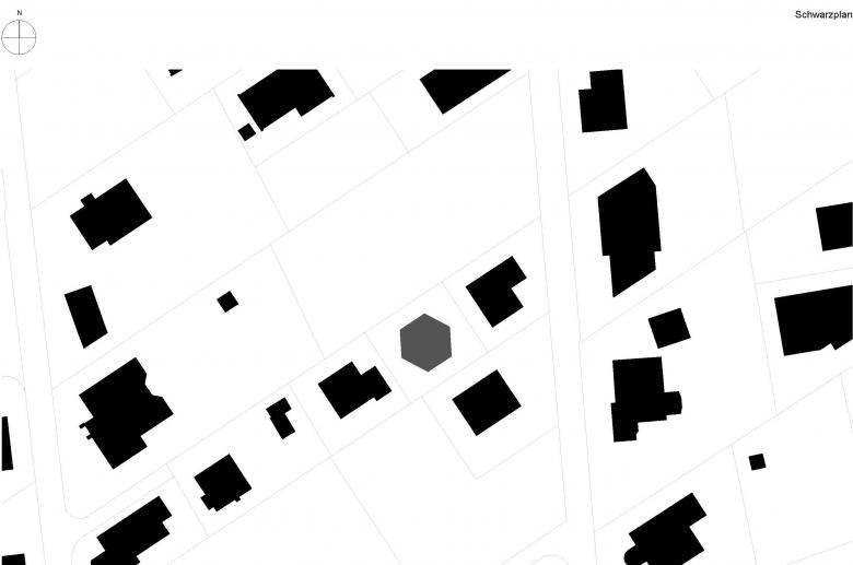 Am südlichsten Punkt von Liechtenstein < in den Gärten > zwischen den drei bebauten Parzellen platziert sich das sechseckige Prisma. Gebäudeform und Ausrichtung sind der Ausgangslage der Parzelle geschuldet.