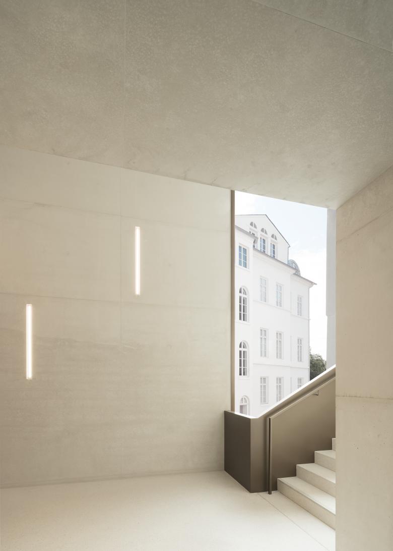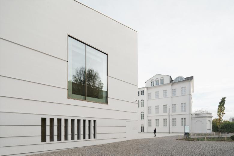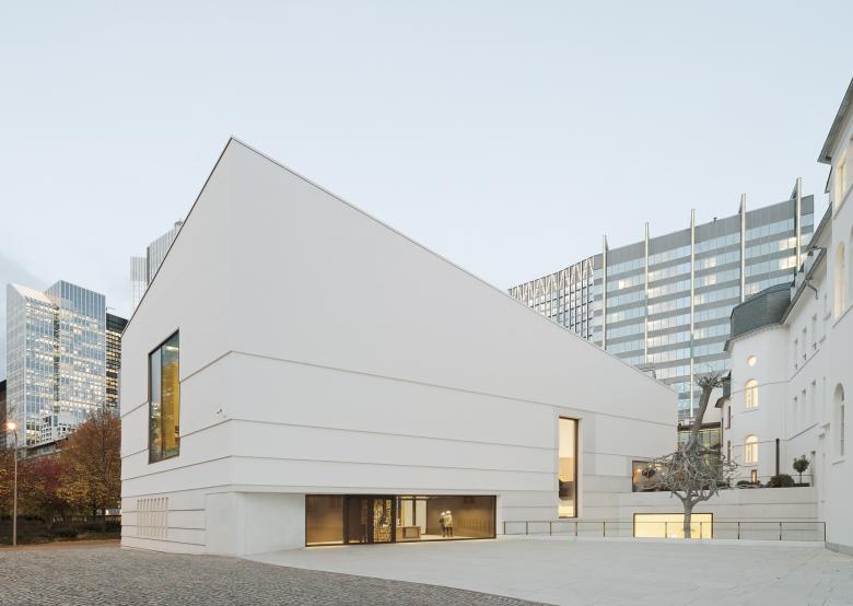 Das Jüdische Museum in Frankfurt wurde um einen Neubau für Veranstaltungen, Wechselausstellungen und Bibliothek erweitert, der auch den neuen Haupteingang zum Museum bildet. Der Baukörper liegt im ehemaligen Garten zweier klassizistischer Palais, die das Museum bisher beheimateten. Um ihn zur neuen Adresse des Museums zu machen und gleichzeitg die Typologie der Mainufer-Palais aus Villenzeile, Garten und Wirtschaftsgebäude zu bewahren, wurde ein freistehendes Volumen konzipiert, das mit dem Bestand einen Eingangshof bildet, der sich seitlich zu den Wallanlagen öffnet.