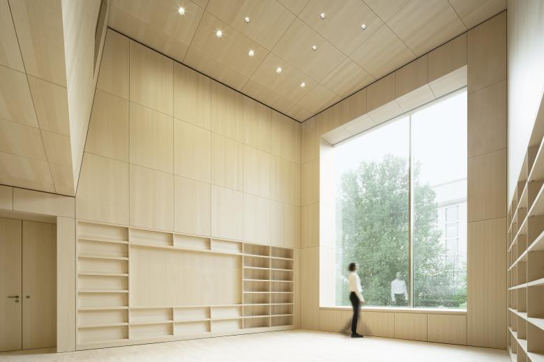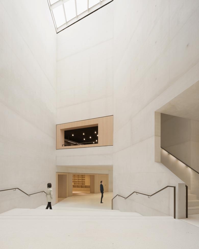 Der Raumeindruck im Inneren des Neubaus ist durch ein Atrium bestimmt, zu dem die öffentlich zugängliche Bibliothek und das koschere Café Sichtfenster ausbilden. Der Lichteinfall von oben inszeniert die Verbindungstreppe zwischen oberem und unterem Foyer, über die die Besucher vom Veranstaltungsbereich im Neubau in die Ausstellungsbereiche im Untergeschoss und in den Altbauten gelangen. Bibliothek, Café und Werkstätten sind auf Halbgeschossen um das Atrium organisiert und öffnen sich mit gezielten Ausblicken zur Umgebung.