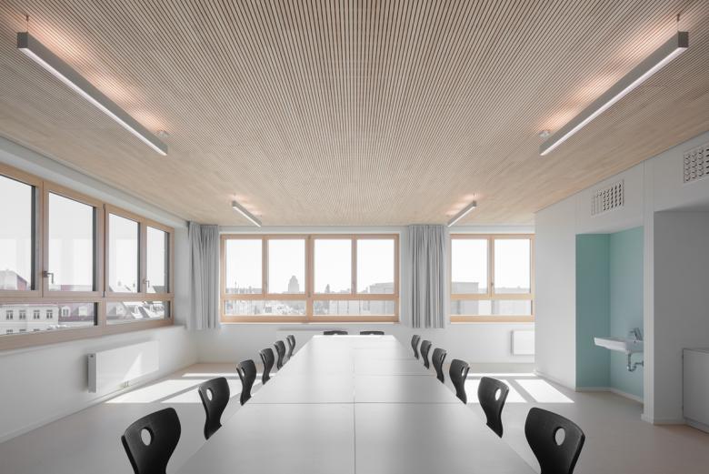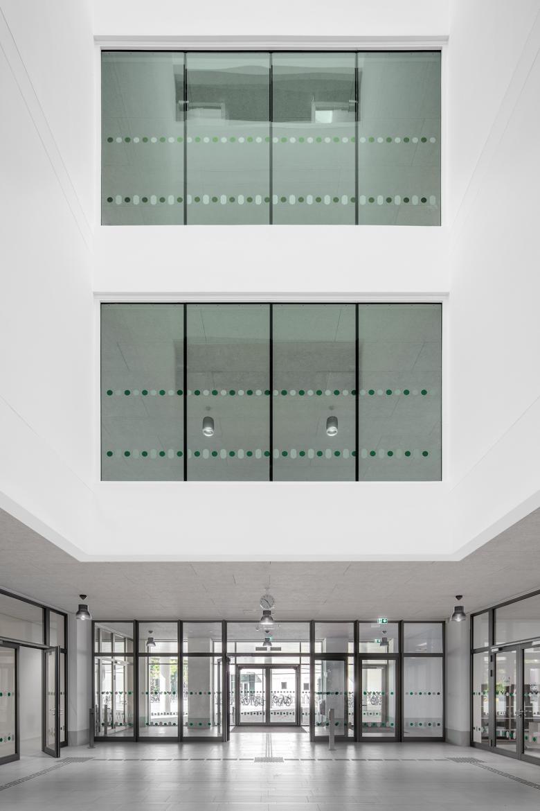 Die Architektur des Schulgebäudes folgt der funktionalen Gliederung des Inneren. Das Erdgeschoss beherbergt öffentliche Bereiche wie Foyer, Bibliothek, Mensa und Aula, die über großzügige Verglasungen eine Verbindung zum Stadtraum herstellen. In den Obergeschossen sind die Unterrichts- und Fachräume um zentrale Flurzonen angeordnet, die als offene Lernlandschaften gestaltet sind. Die Erschließung erfolgt über eine Scherentreppe, die zusammen mit den angrenzenden Lufträumen eine natürliche Belichtung über mehrere Etagen ermöglicht. Über ein zentrales Oberlicht wird Tageslicht in alle Etagen gelenkt, was die offene und kommunikative Atmosphäre im Gebäude unterstützt.