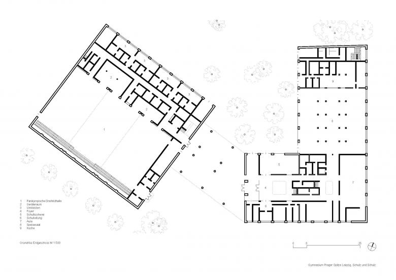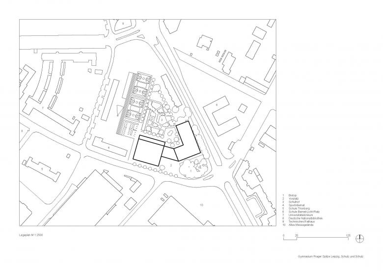 Der von der Straßenkreuzung hinter das Biotop zurückgesetzte Hochpunkt der Schule formuliert ein städtebauliches Zeichen und schafft einen neuen Orientierungspunkt im Stadtraum. Der Schulbaukörper orientiert sich vorrangig entlang der Prager Straße und bildet hier eine schützende und stadtraumfassende Raumkante zu der stark frequentierten Verkehrsachse Prager Straße. Die gestapelten Sporthallen entlang der Philipp-Rosenthal-Straße werden über einen zurückgesetzten Brückenkörper mit der Schule verbunden. Gebäudesetzung und Schulvorplatz bilden die Adresse der Bildungseinrichtung, während die Schul- und Sportfreiflächen im geschützten rückwärtigen Bereich angeordnet sind.