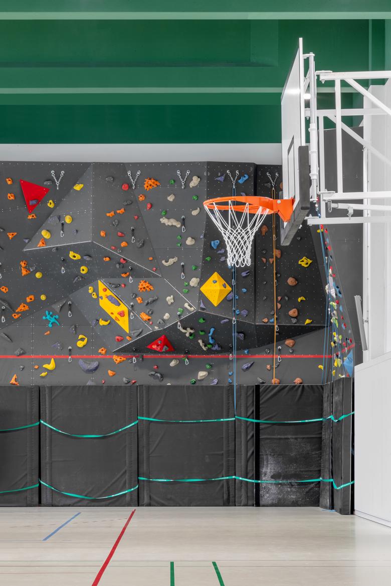 Die obere Dreifachhalle umfasst eine sieben Meter hohe Kletterwand und bietet verschiedene Nutzungsmöglichkeiten für den Schul- und Vereinssport.