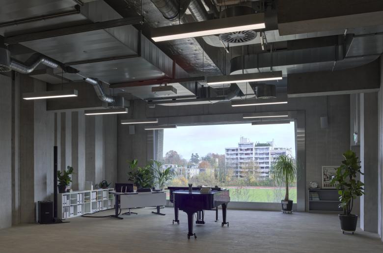 Zwei Gebäude – ein Ziel vor Augen. Die Direktheit der Architektur muss in das Beleuchtungskonzept integriert werden. Deshalb kommen keine Einbauleuchten zum Einsatz. Aufbau- und Pendelleuchten, teilweise direkt an der Haustechnik befestigt, beleuchten die unterschiedlichen Räume. Die Aula, eine Holzschatulle, wird neben einer Grundbeleuchtung, durch eine Objektleuchte aus dickschichtpassiviertem Lochblech ins richtige Licht gerückt.