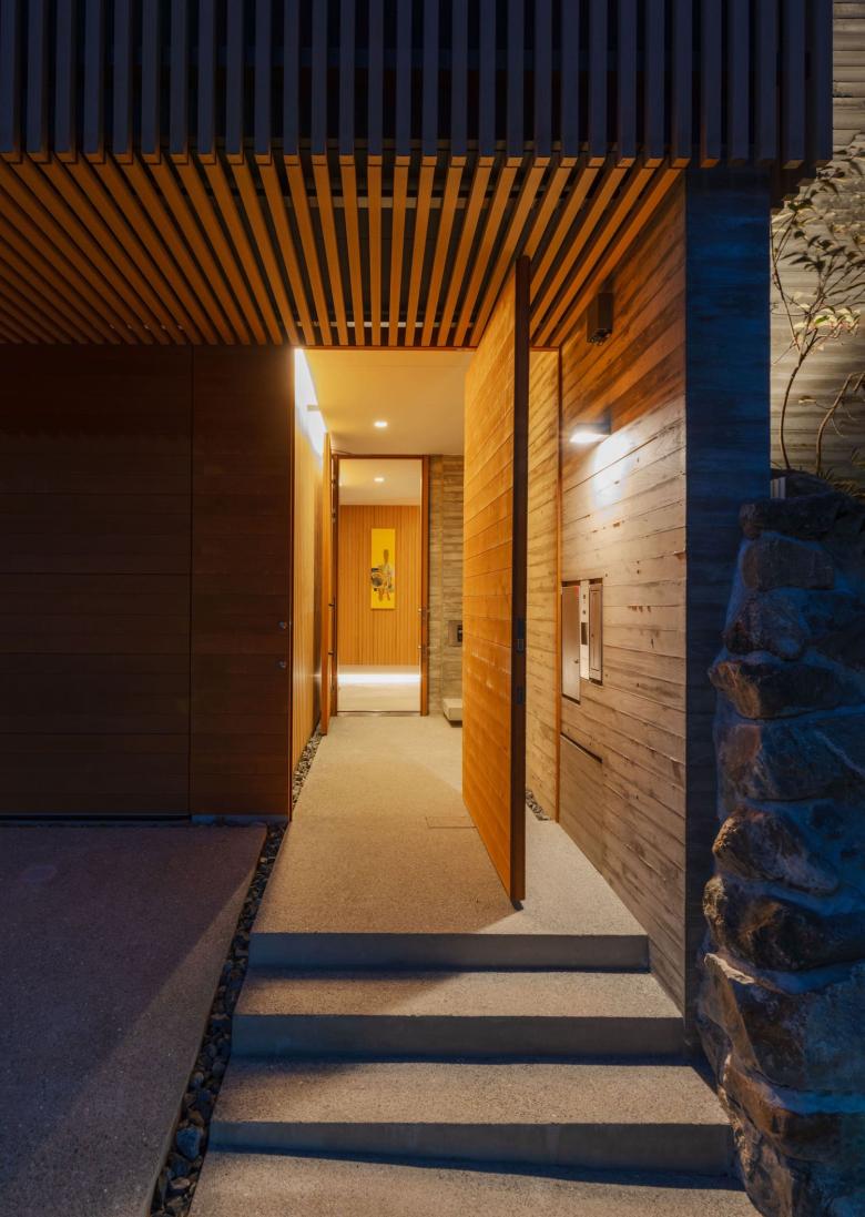 Externally, the three-storey structure is a box-shaped exposed concrete formwork. The basement level features uniform horizontal timber cladding from the gate to the garage. The first floor incorporates resin louvers covering the entire terrace parapet.From the second floor and roof slab, cantilevered beams support exposed concrete walls with cedar formwork, creating a floating screen.The unique exterior is formed by the interplay of three textures: the softness of wood, the delicacy of the louvers, and the solidity of the concrete, enhanced by the overflowing greenery from the terrace.
