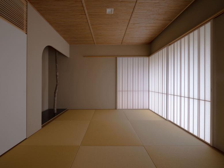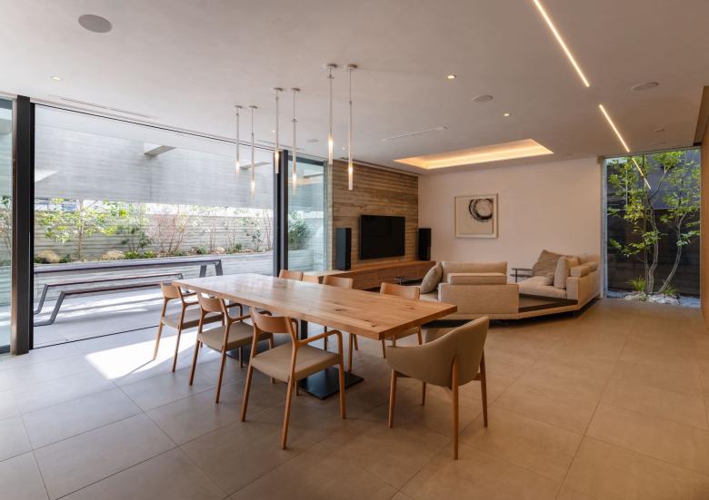 Bordered by the kitchen, the north side features a spacious living area contrasted by human-scale, tranquil spaces: a study and a Japanese-style room. These rooms offer views of the serene north garden.The design allows one to enjoy spatial variation by coexisting on the same floor a spacious communal area and the tranquil northern spaces.